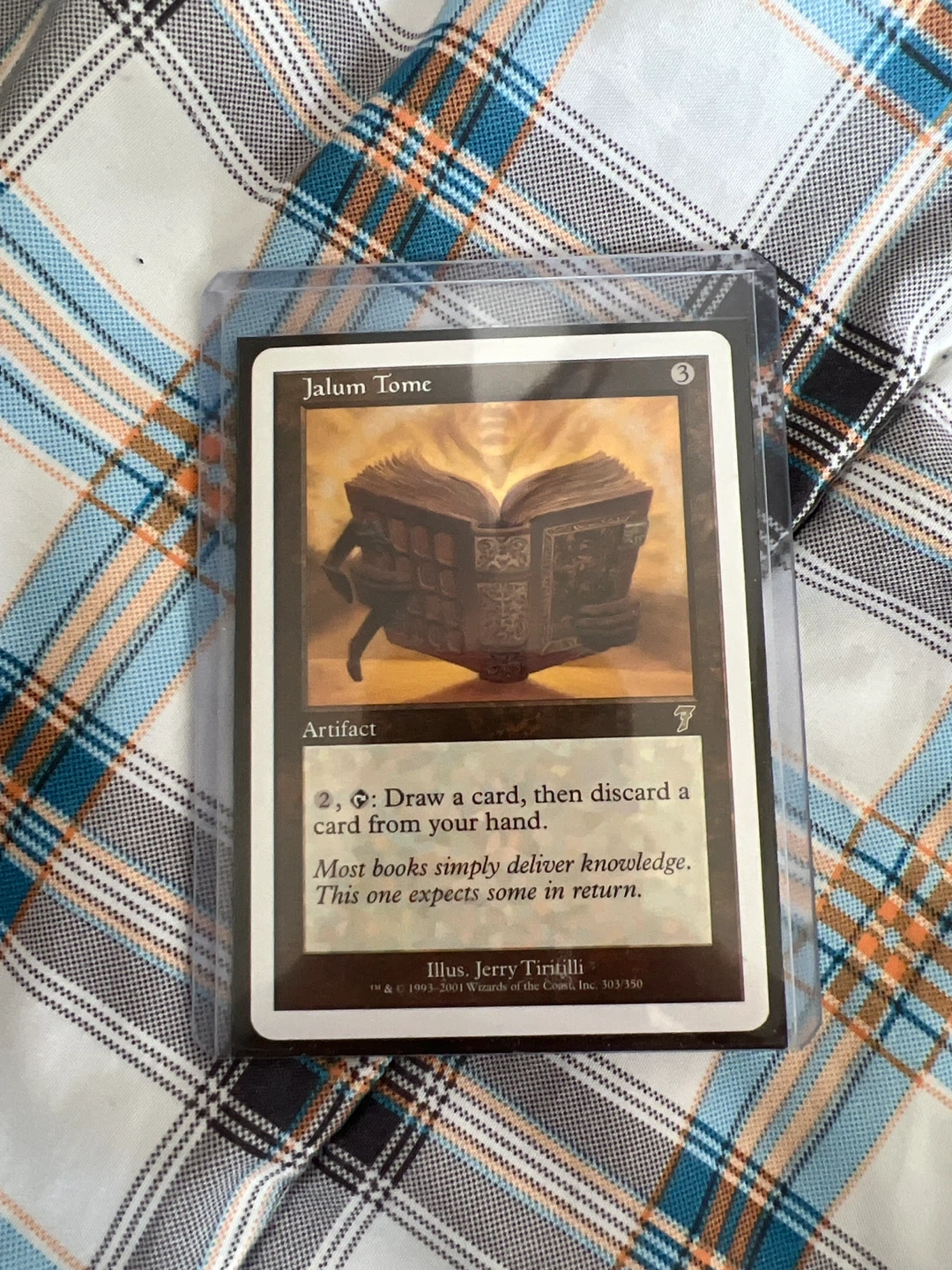 Two Magic The Gathering cards: Jalum Tome and Tonic Peddler. Both cards are in protective sleeves.