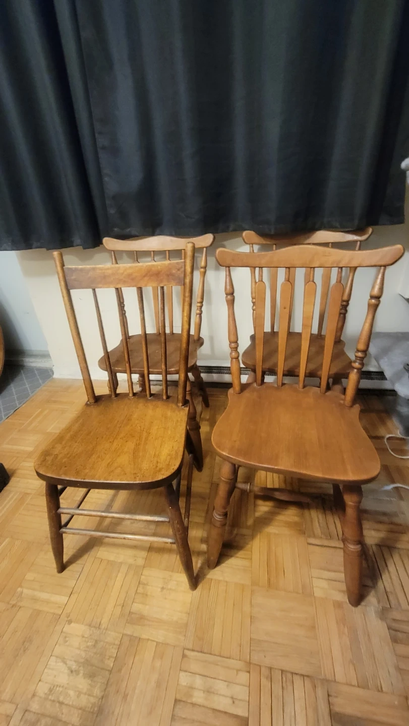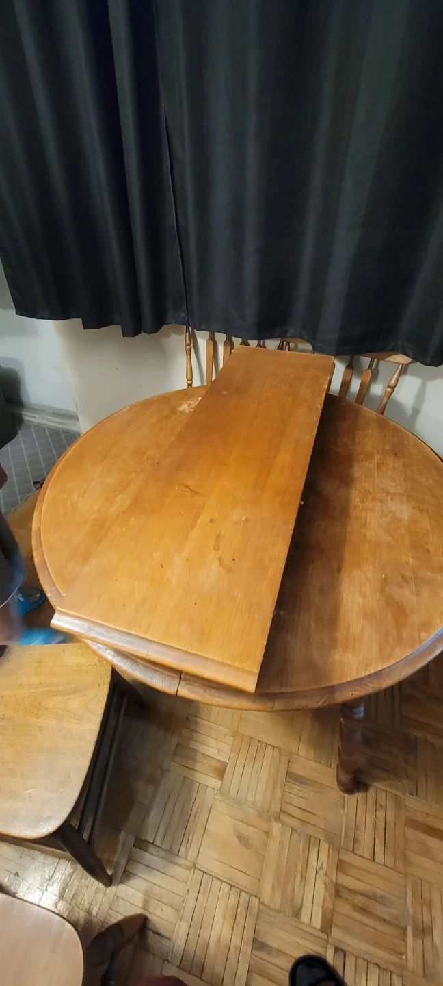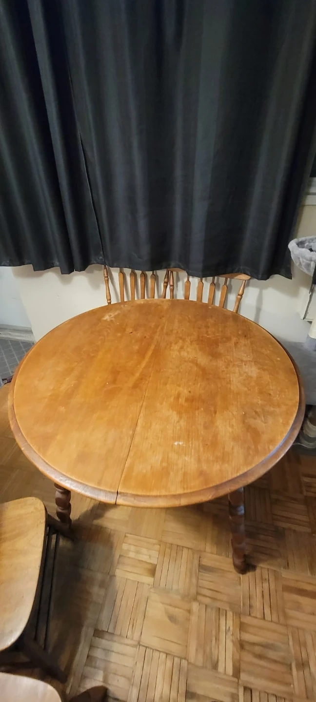 Round wooden dining table with a drop leaf design. Includes four matching wooden chairs. Table diameter is approximately 52 inches when fully extended. Wood construction throughout.