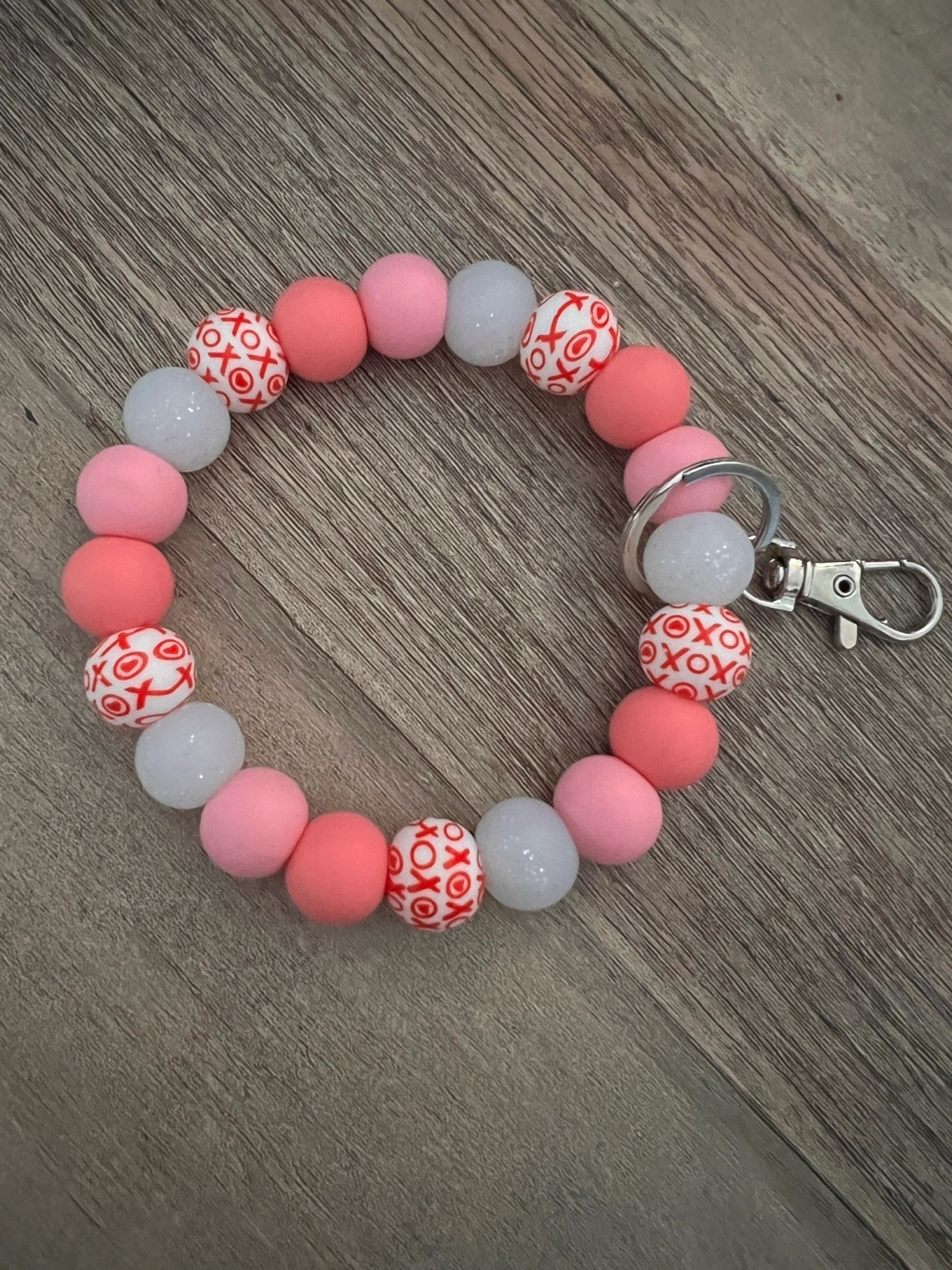 Cute Wristlet keychain! Features pink, coral, and white beads, with some beads having an 'XOXO' design. Perfect for adding a little flair to your keys or bag