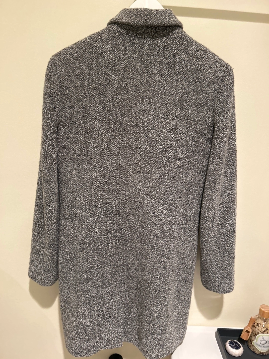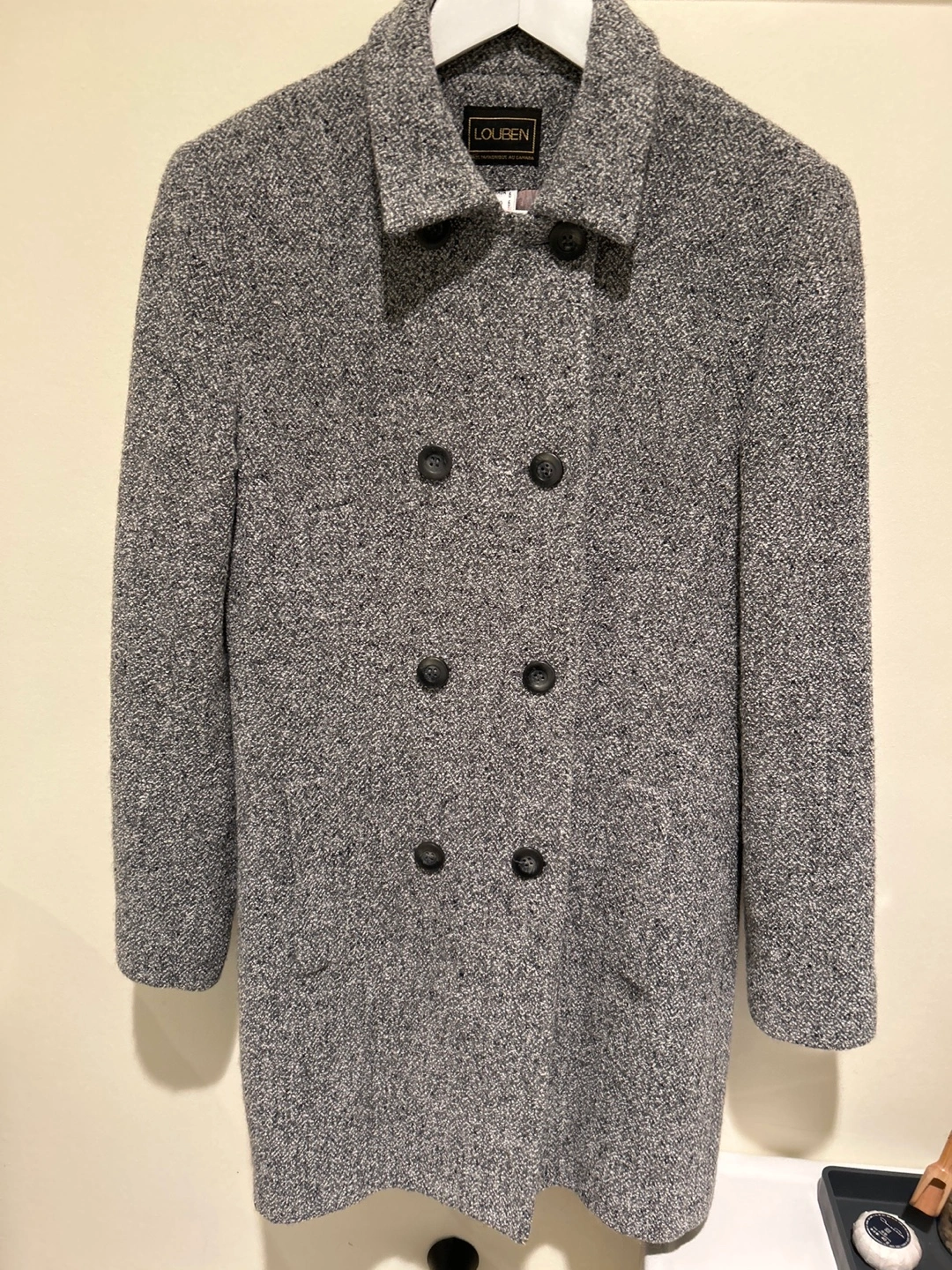 This Louben women's double-breasted coat is a stylish outerwear piece. It features a textured grey tweed-like fabric with a classic collar and button closure. Made in Canada.