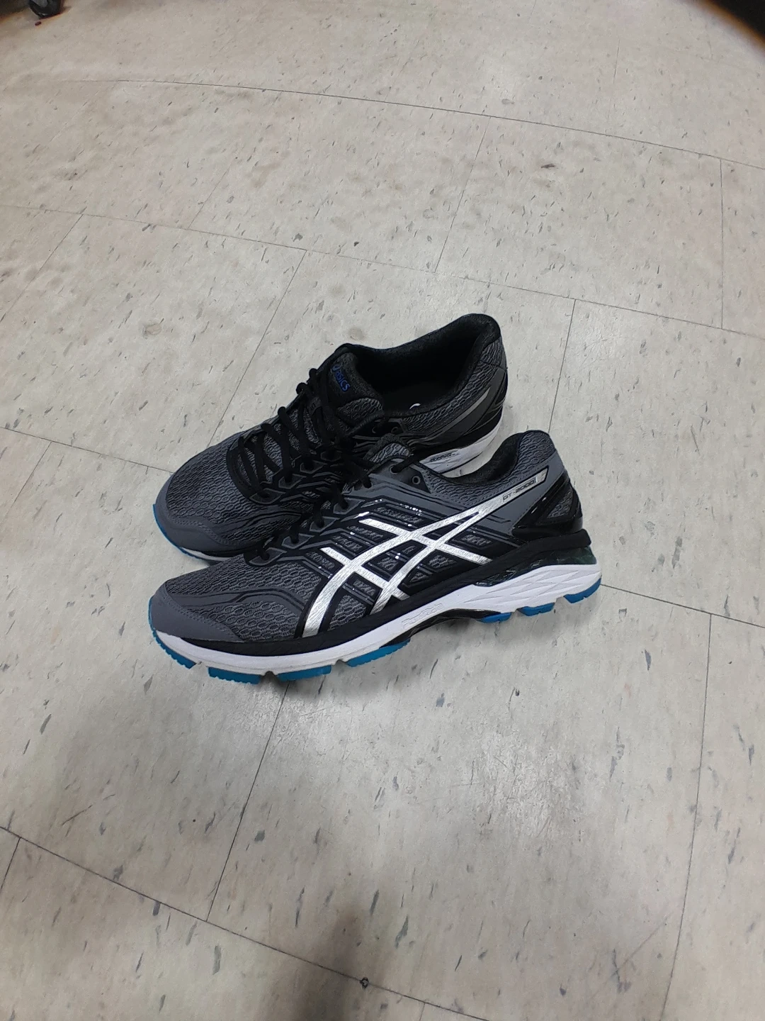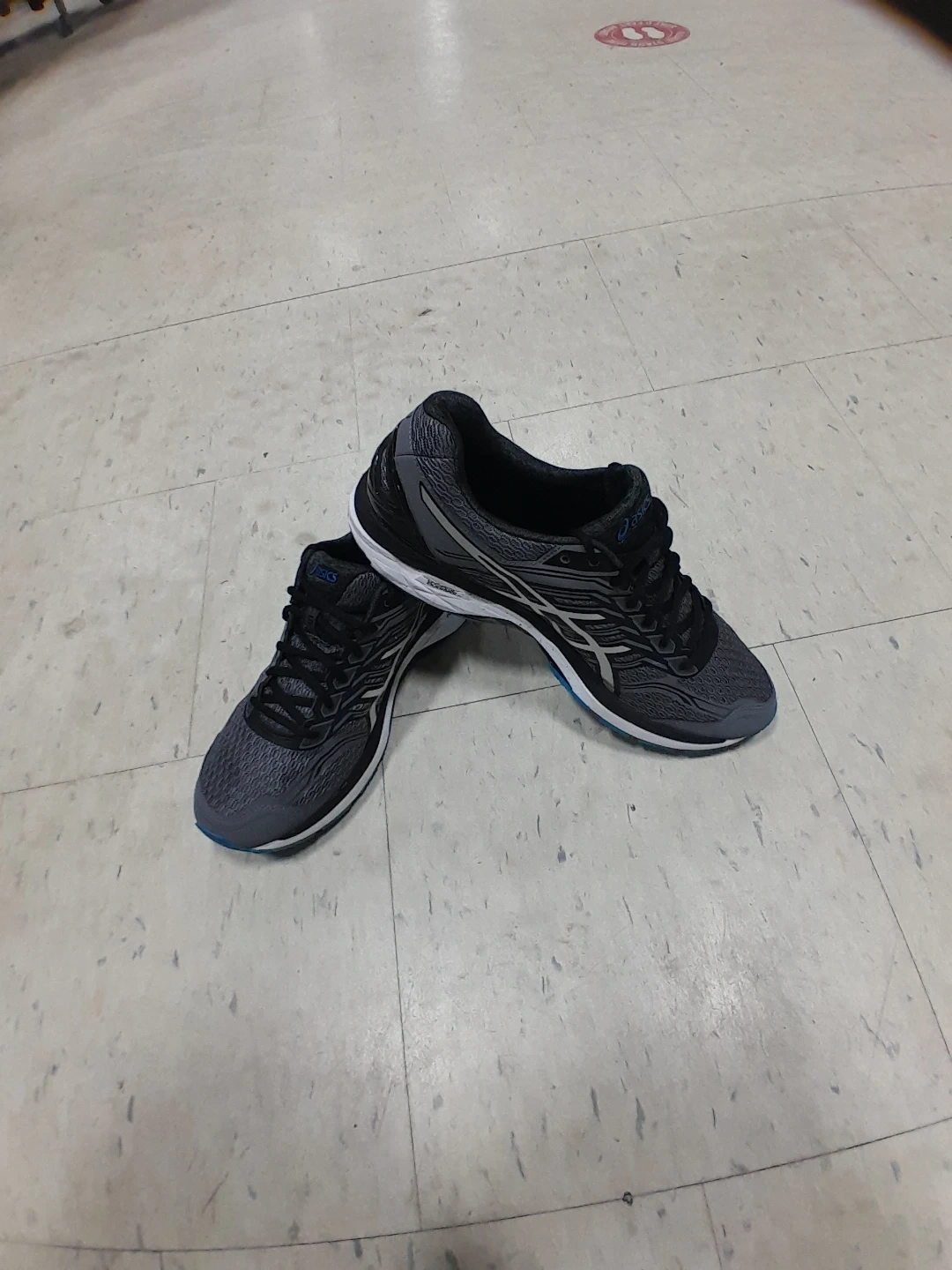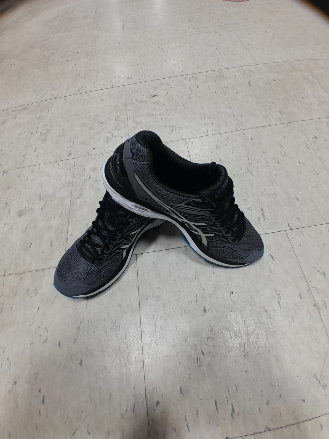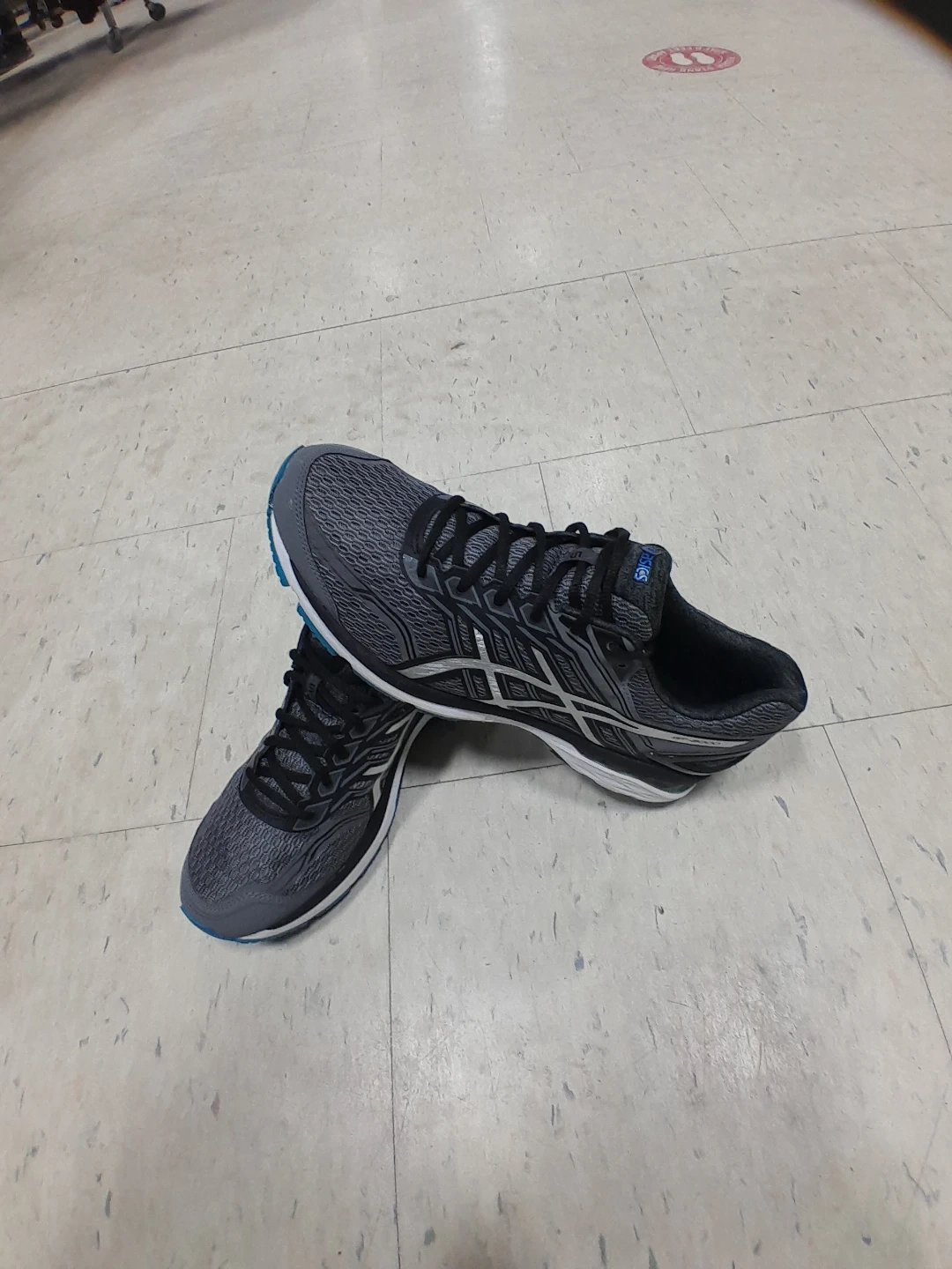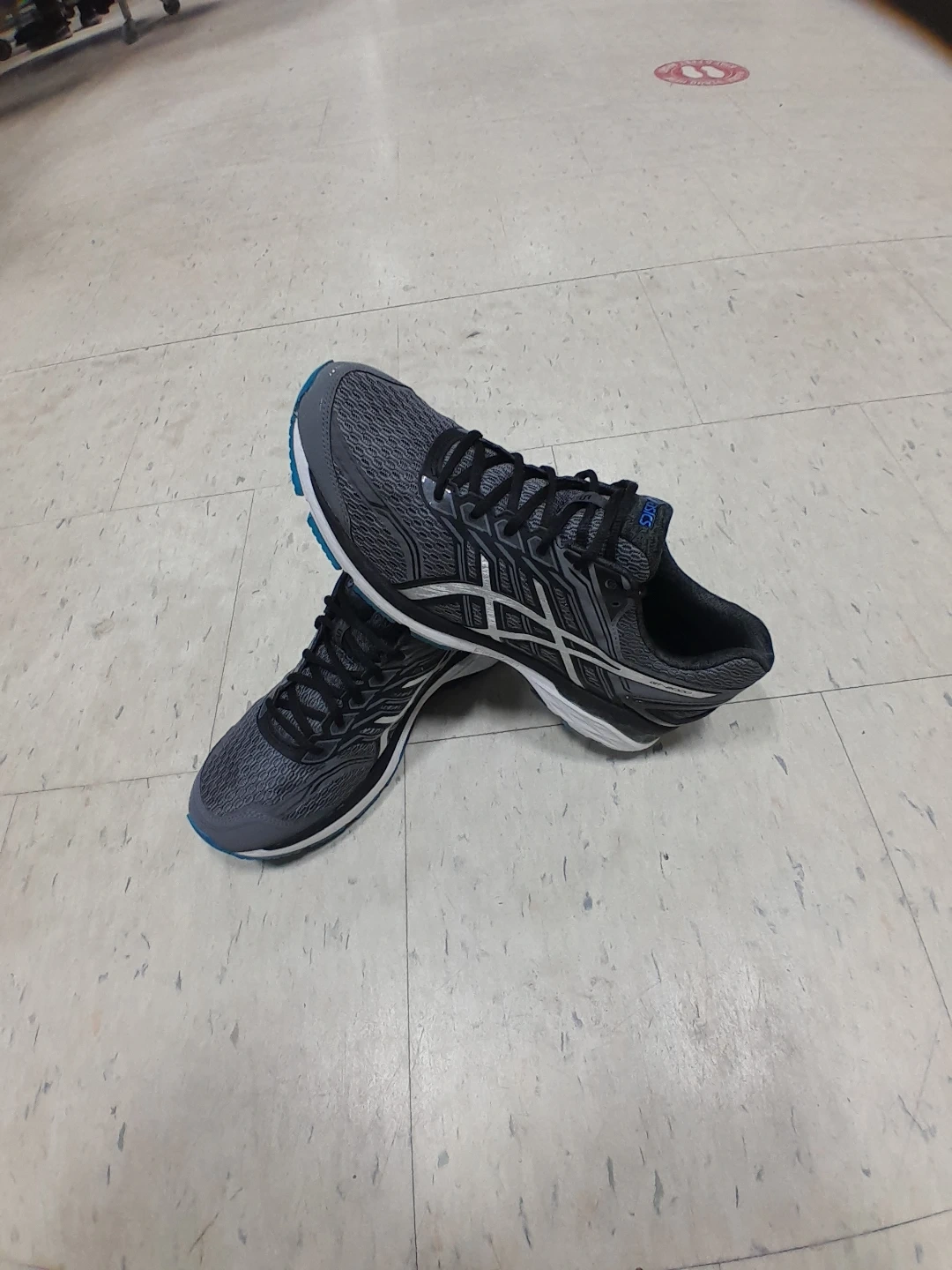 ASICS Gel-Cumulus 20 running shoes in grey and black with white accents. These shoes feature a breathable mesh upper and GEL cushioning for comfort. The rubber outsole provides good traction. Men's size 11