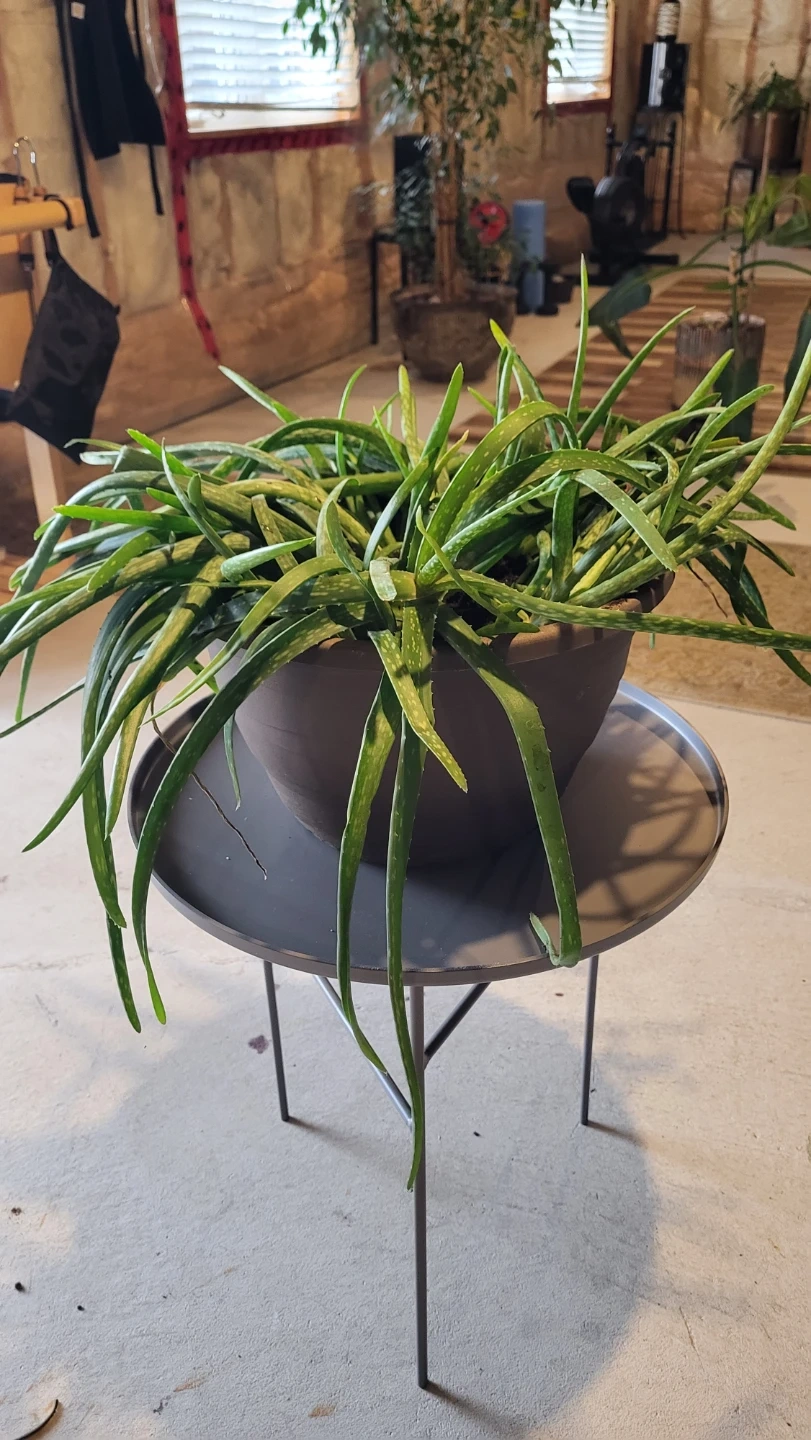 This is a healthy aloe vera plant potted in a dark brown container. It's a great plant to have around. It's easy to care for and has many uses.