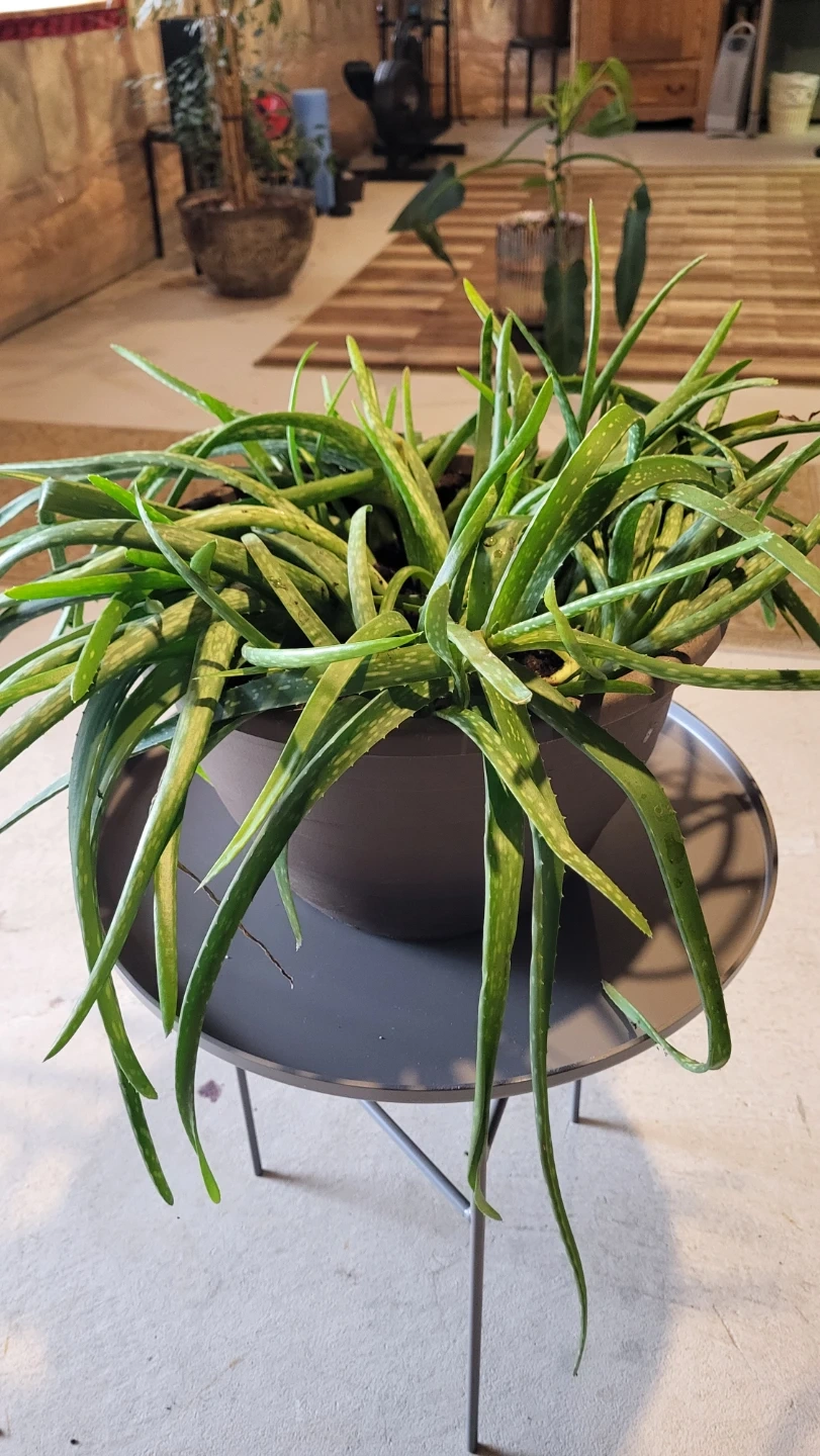 This is a healthy aloe vera plant potted in a dark brown container. It's a great plant to have around. It's easy to care for and has many uses.