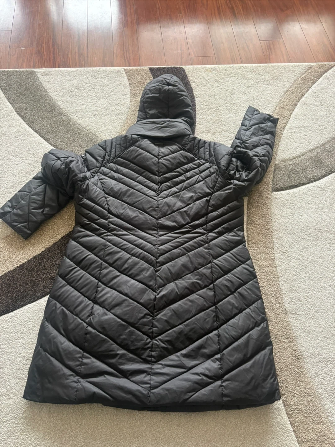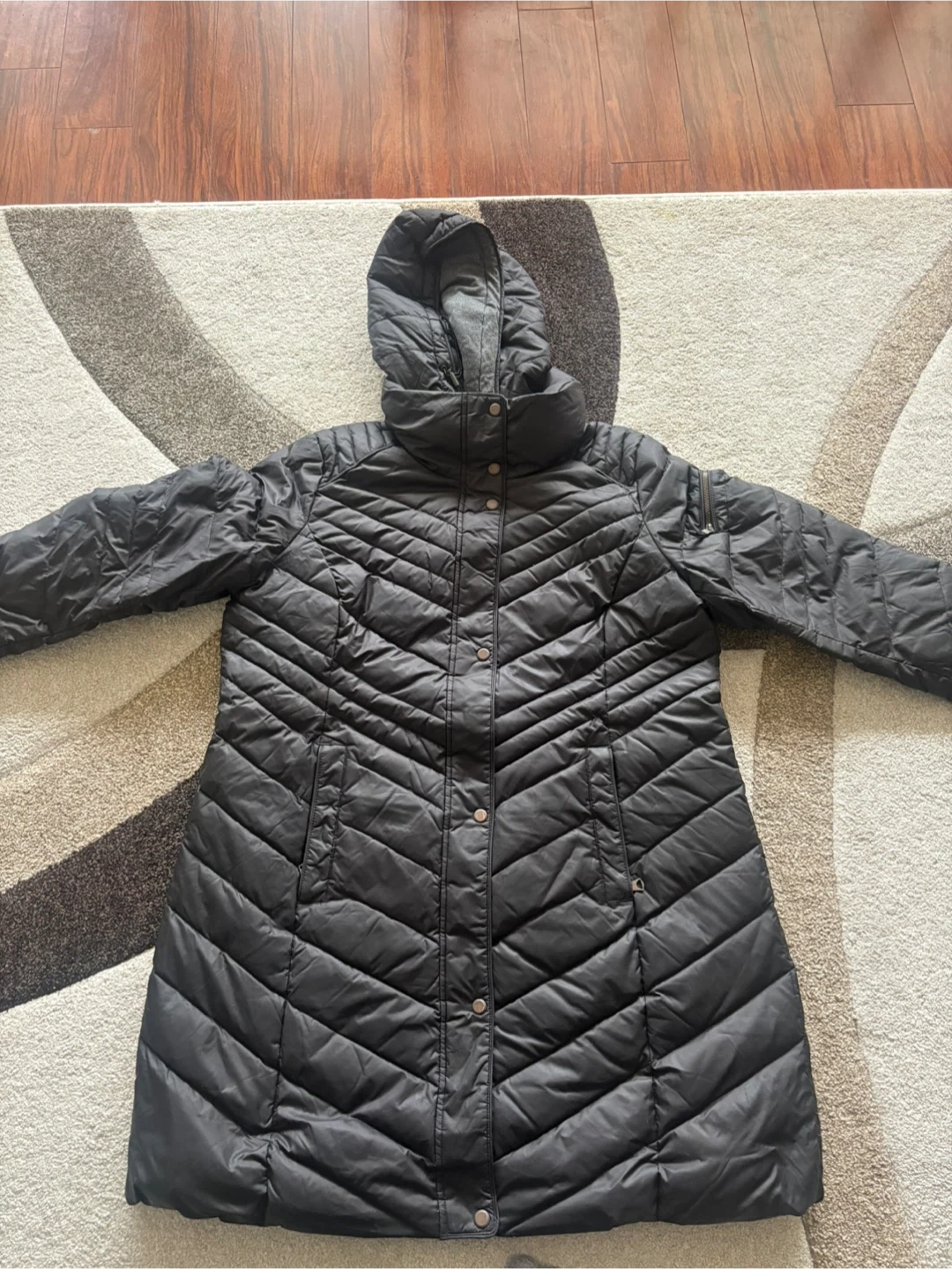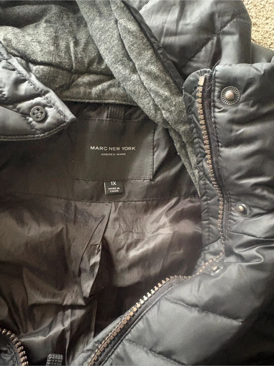 This Marc New York Andrew Marc women’s puffer coat is black. It features a full zip closure with snap buttons and a hood. Size is 1X. Keep warm with this stylish jacket!