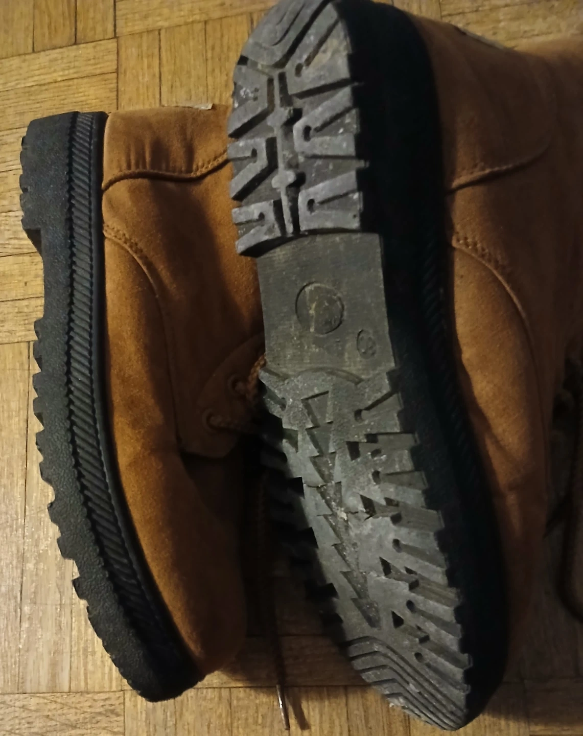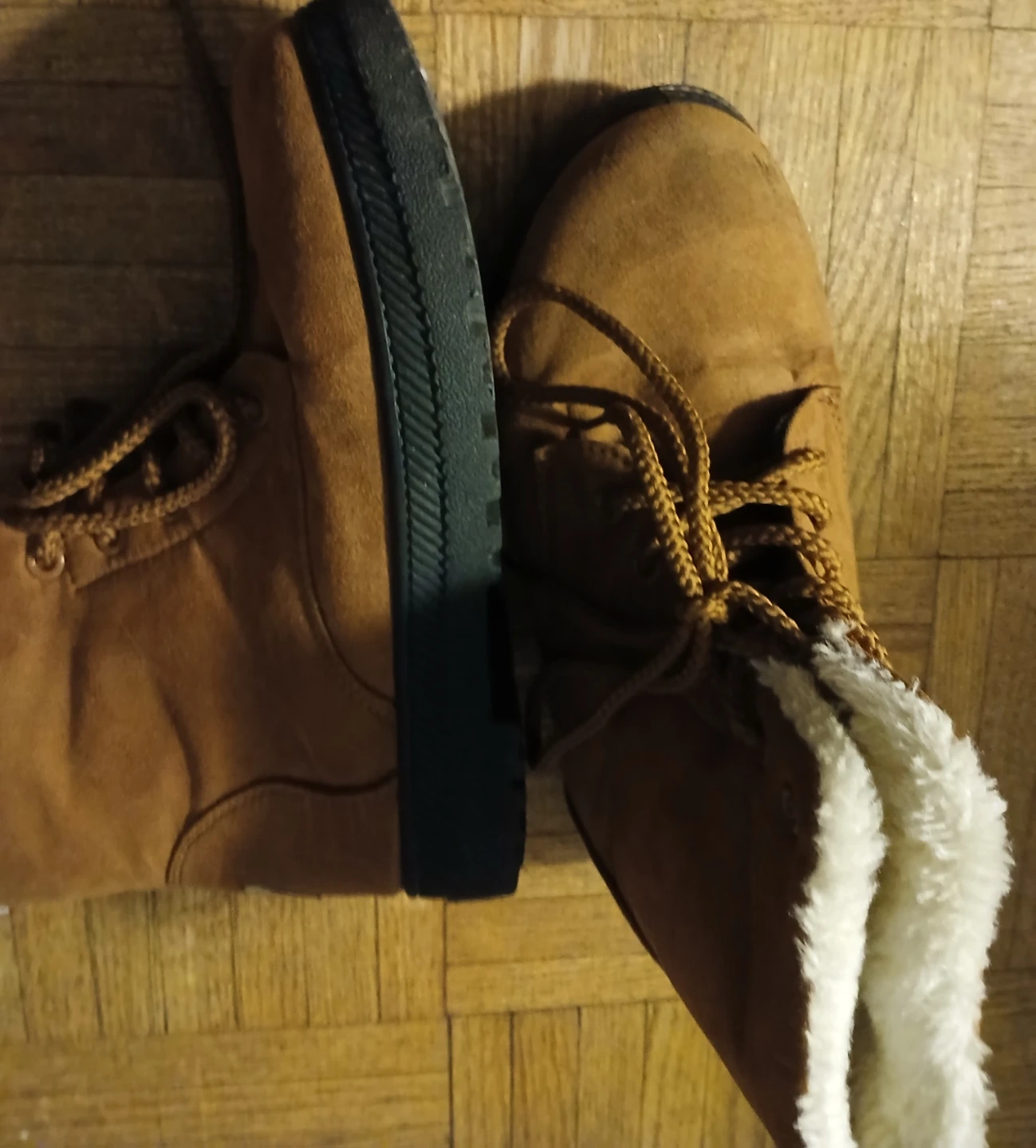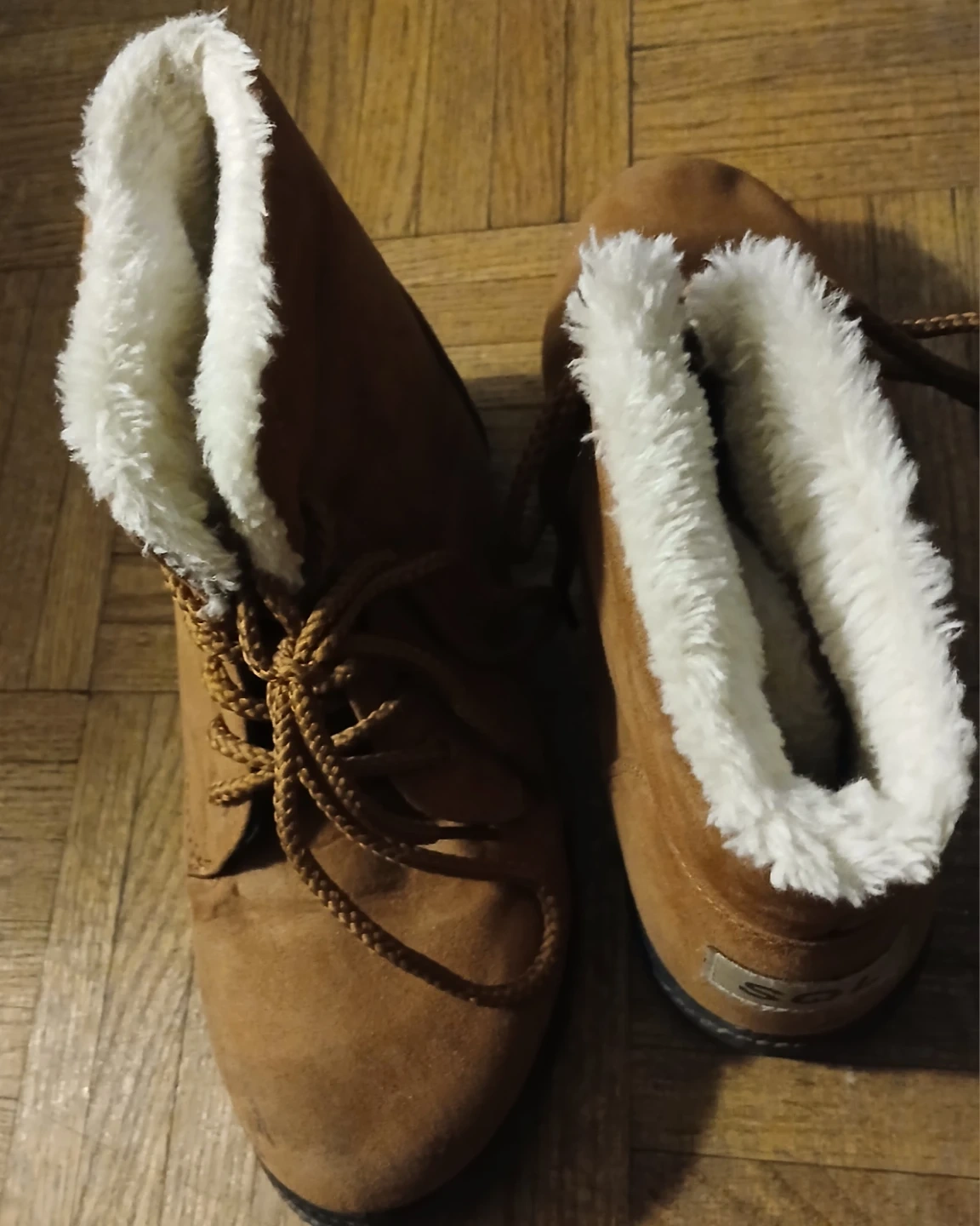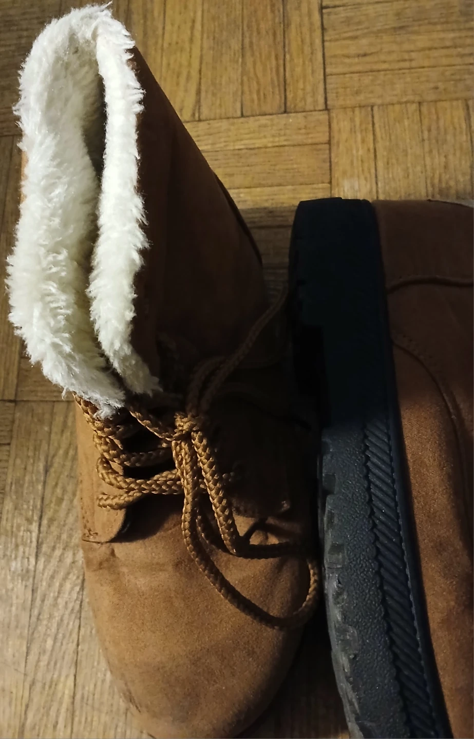 Cozy brown ankle boots with a faux fur lining for warmth. Features a lace-up front and a sturdy sole. Perfect for chilly days!kids size 5