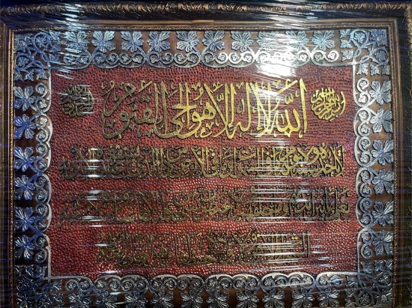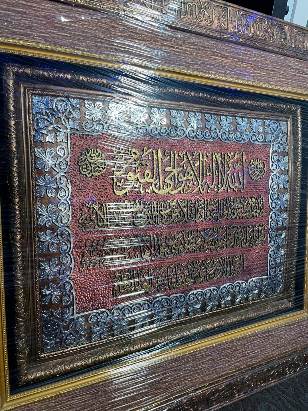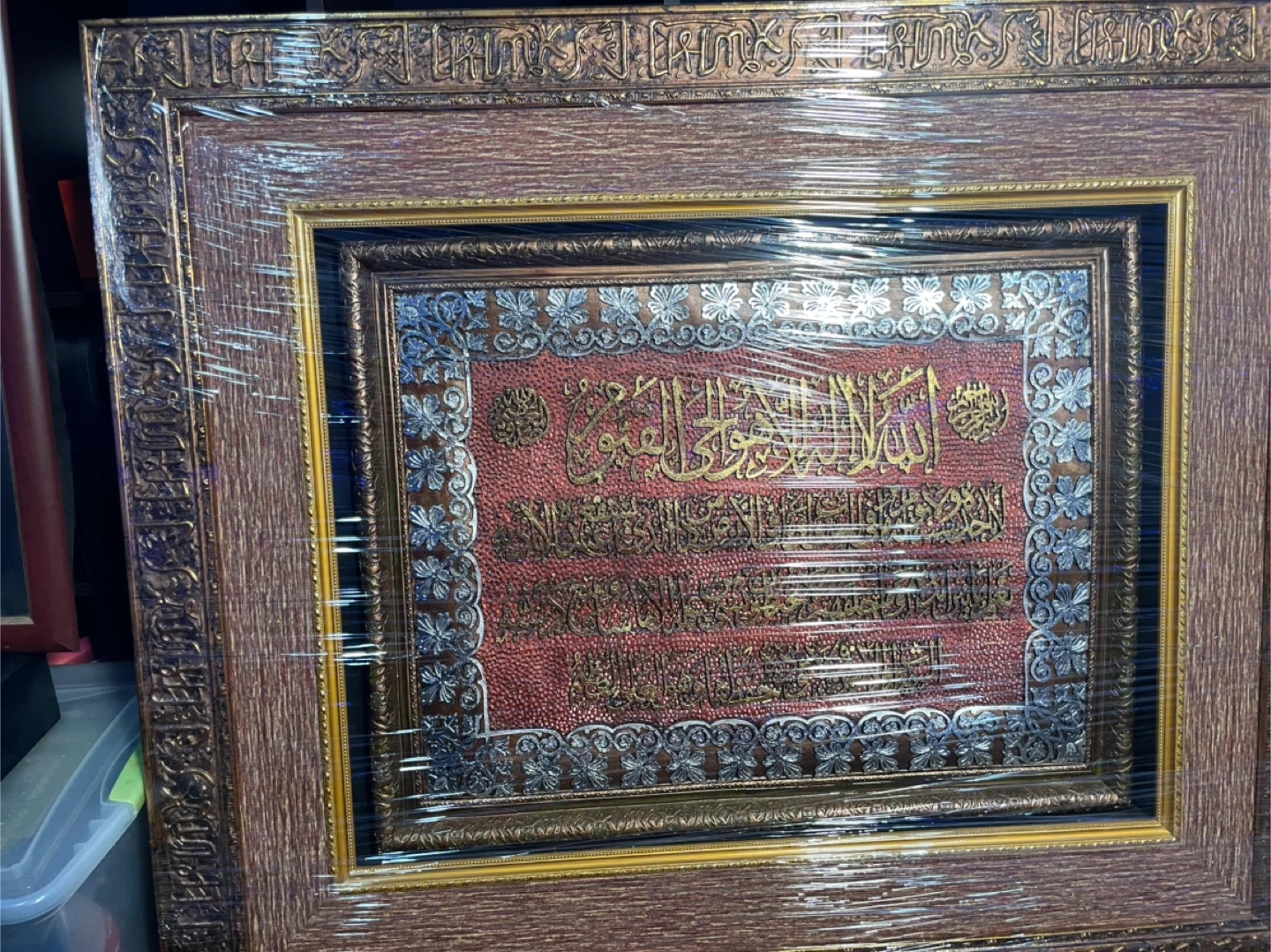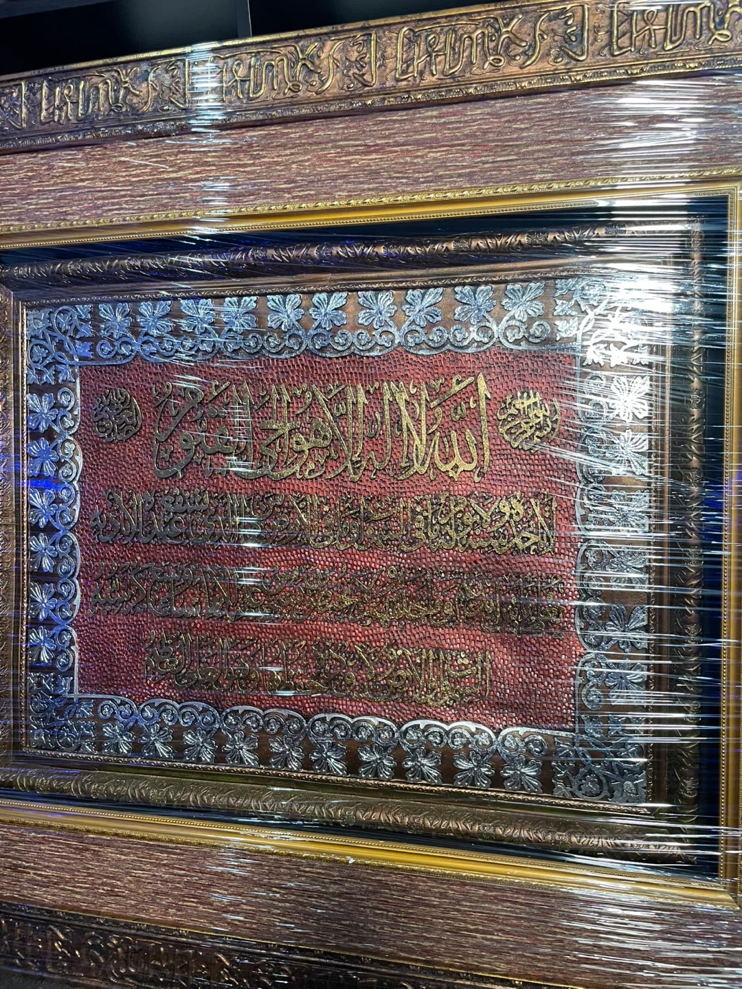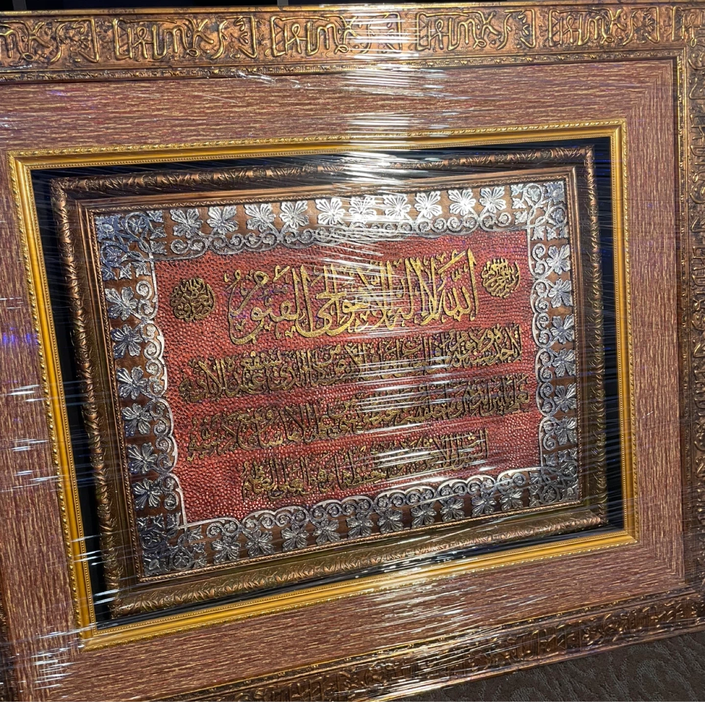 Beautiful framed artwork featuring Arabic calligraphy. It has intricate detailing with gold and silver accents on a textured red background. The frame is a warm wood tone with decorative elements. This piece would add a touch of elegance to any room. Worth a lot of money, originally bought for close to $1000. Currently in the process of moving which is why I’m selling it. It is in completely new/excellent condition, no damage, perfectly fine. $650 might seem like a lot, price can be negotiated to a reasonable amount. The picture is high quality, heavy, and is 40 x 40 inches. Wrapped up nearly in Saran Wrap for protection purposes.