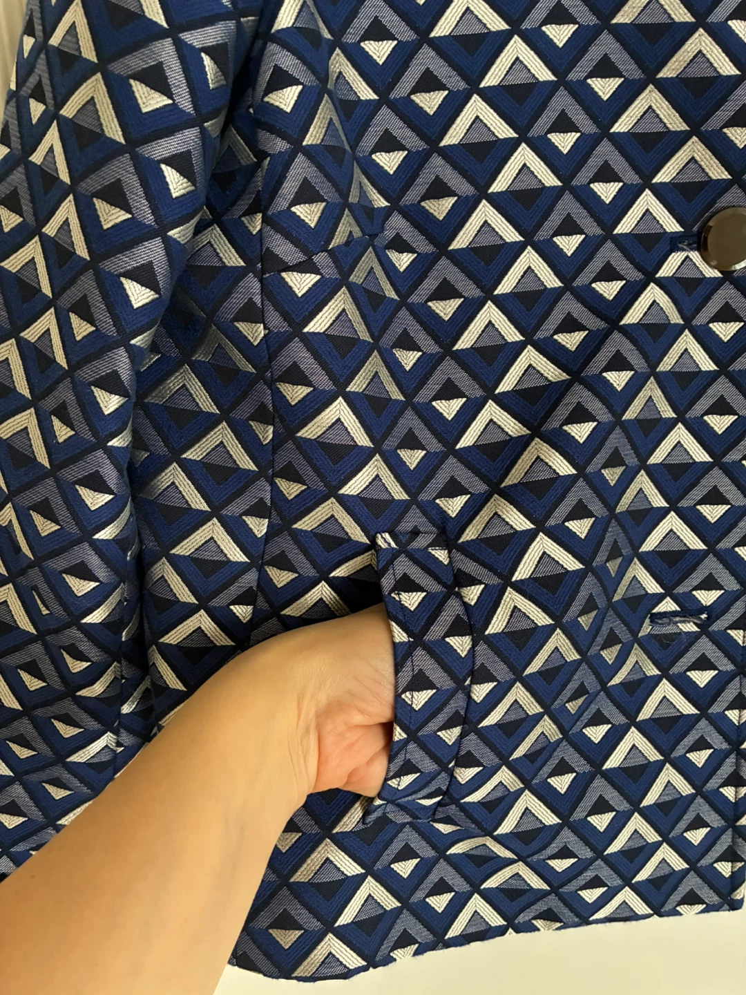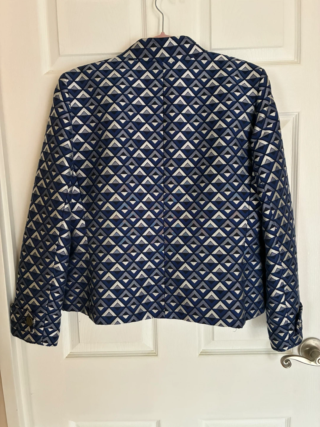 Kasper blazer in a striking blue, silver, and white geometric pattern