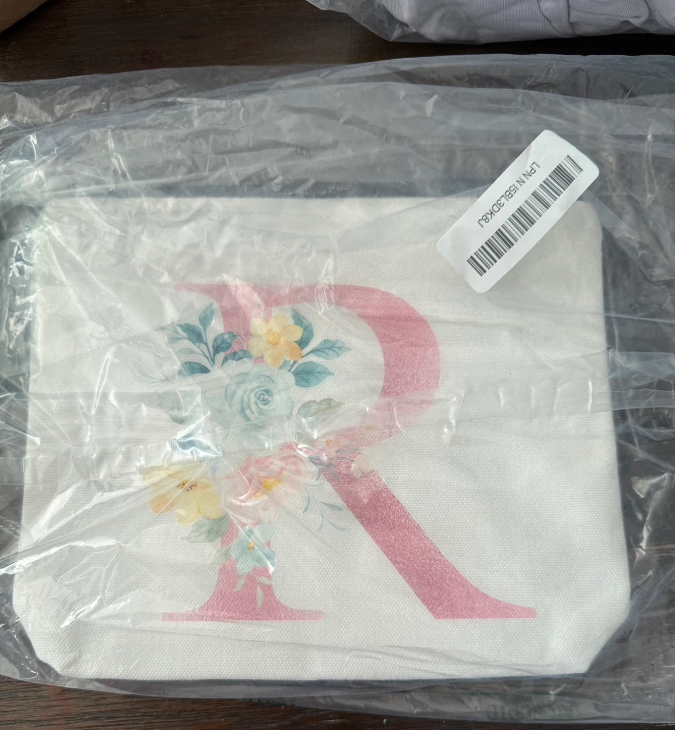This white canvas pouch features a large pink letter 'R' embellished with a delicate floral design. It's perfect for organizing small essentials like makeup or stationery. The zippered closure keeps your items secure.
