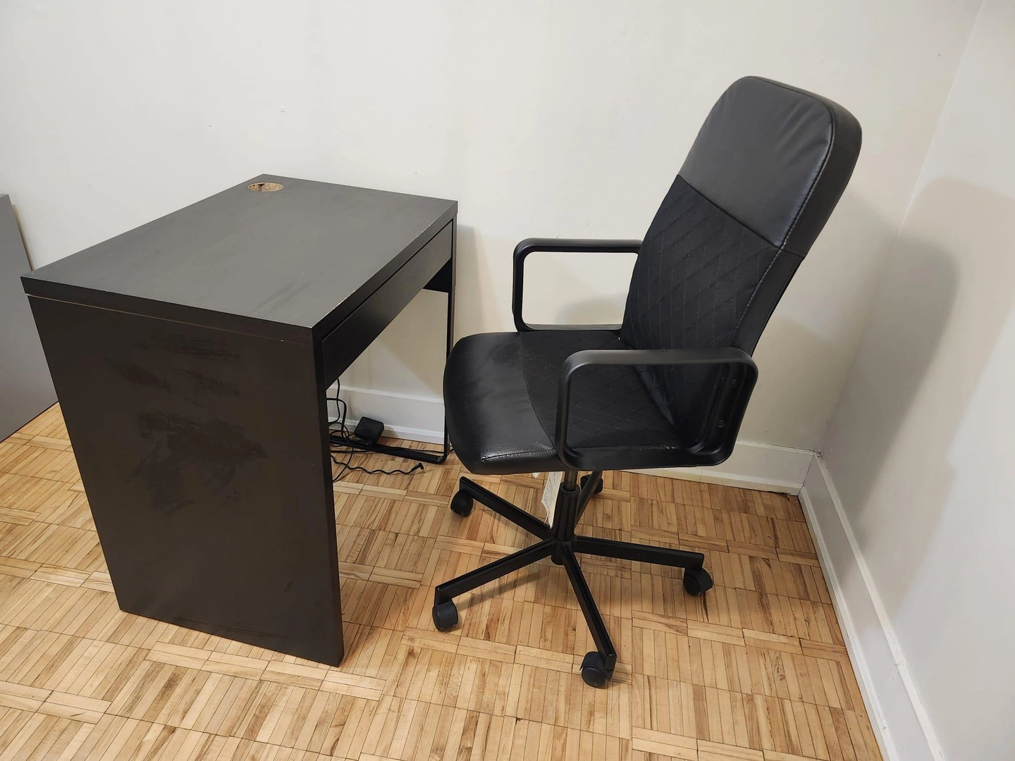 Selling IKEA black desk and office chair set. They're in good condition and ready for a new workspace! The desk has a simple design with a drawer, and the chair is a comfortable office chair with armrests and a rolling base