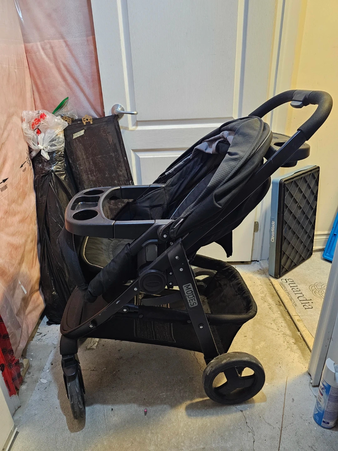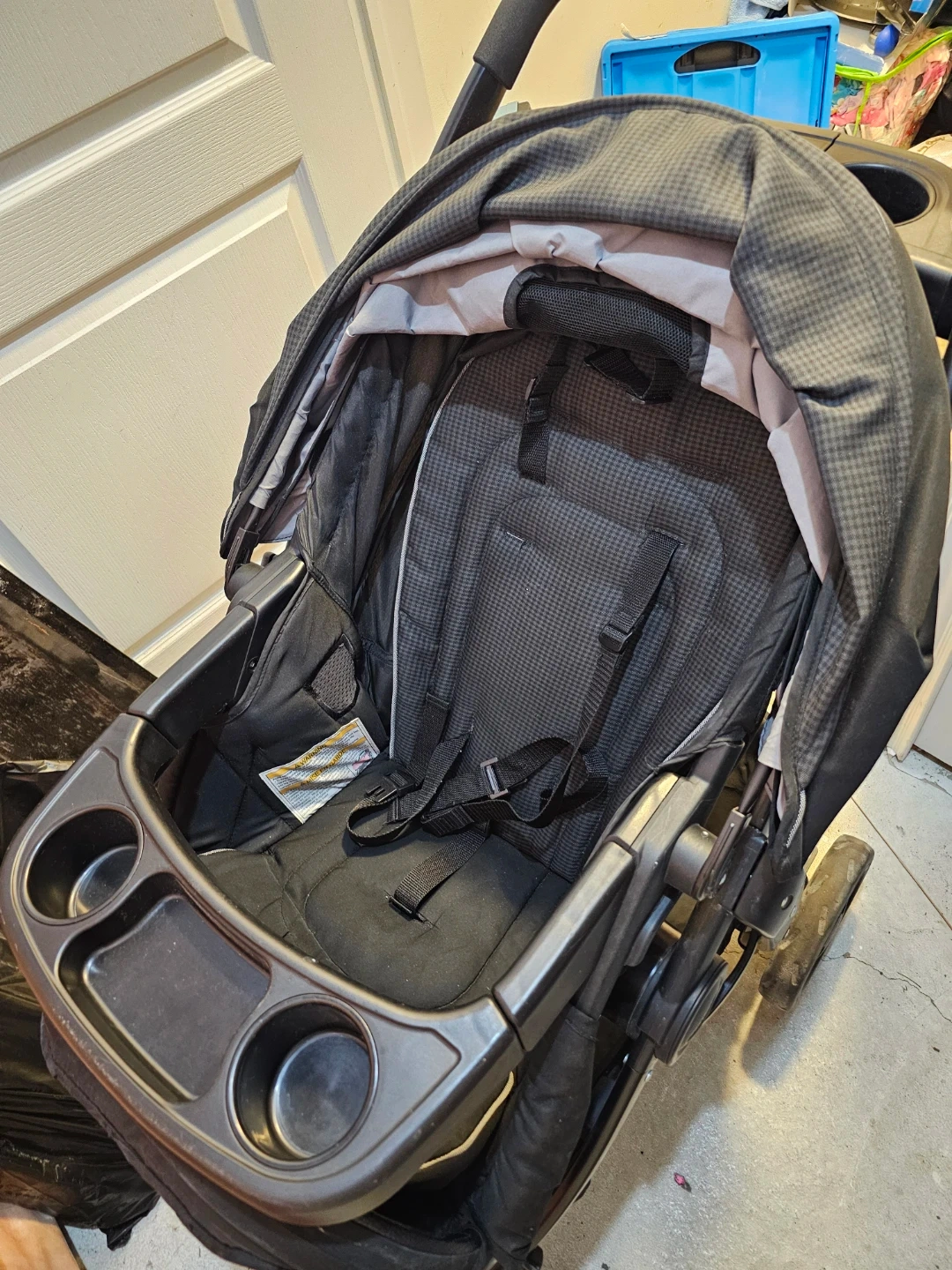 This black Graco stroller features a click connect system for easy infant car seat attachment. It has a large storage basket and a parent console with cup holders. The seat reclines for comfort. It's a handy stroller for daily outings!