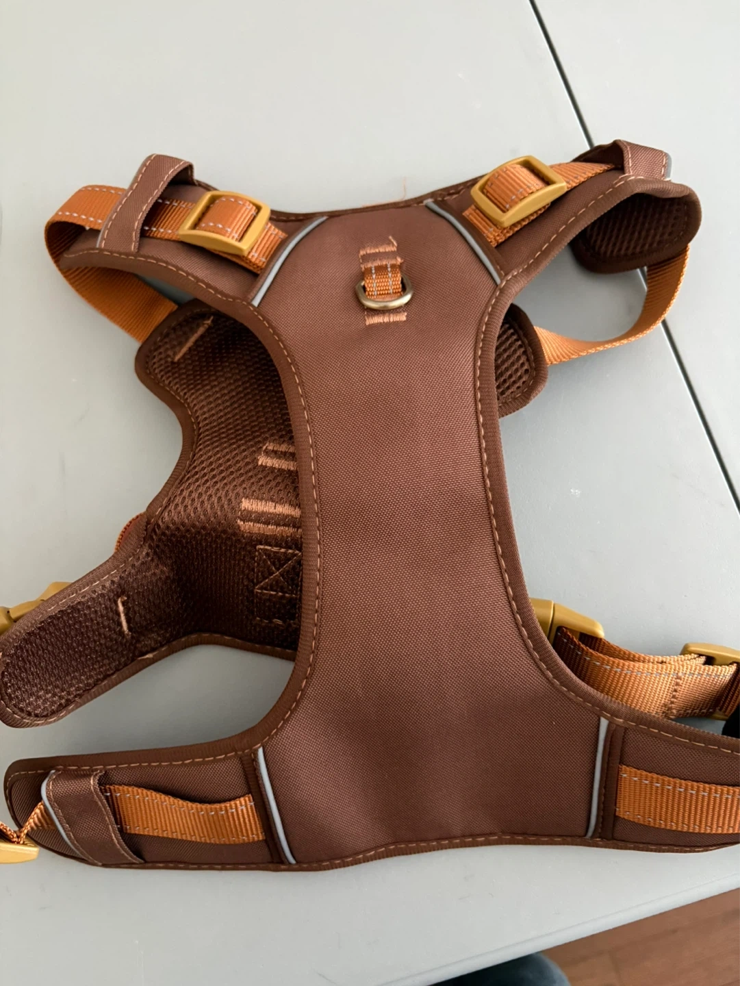 Brown Idog dog harness with adjustable straps and reflective accents. It's made from durable nylon with a padded mesh lining for comfort. This harness is designed for everyday walks and training.