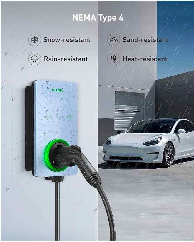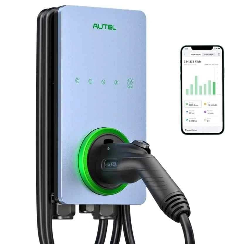 Powerful Autel Level 2 EV charger. Charges super fast, up to 50A, adding about 37 miles per charging hour. Works with most electric cars, including Tesla, BMW, Ford, Mercedes, and Kia. Built tough with a NEMA Type 4 rating, it's resistant to rain, snow, sand, and heat. Home Smart AI Electric Vehicle (EV) Charger, Wi-Fi and Bluetooth Enabled EVSE, with in-Body Holster and 25-Foot Cable. Hardwired. Sierra Blue color.