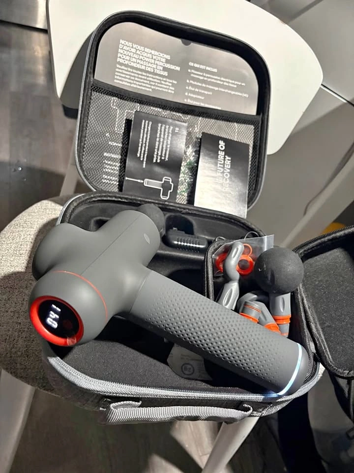Uses percussive therapy to target sore muscles and knots. Offers up to 4.5 hours of operation on a single charge. Features 6 different speed settings to customize intensity. Includes 6 interchangeable attachments for targeting different muscle groups.