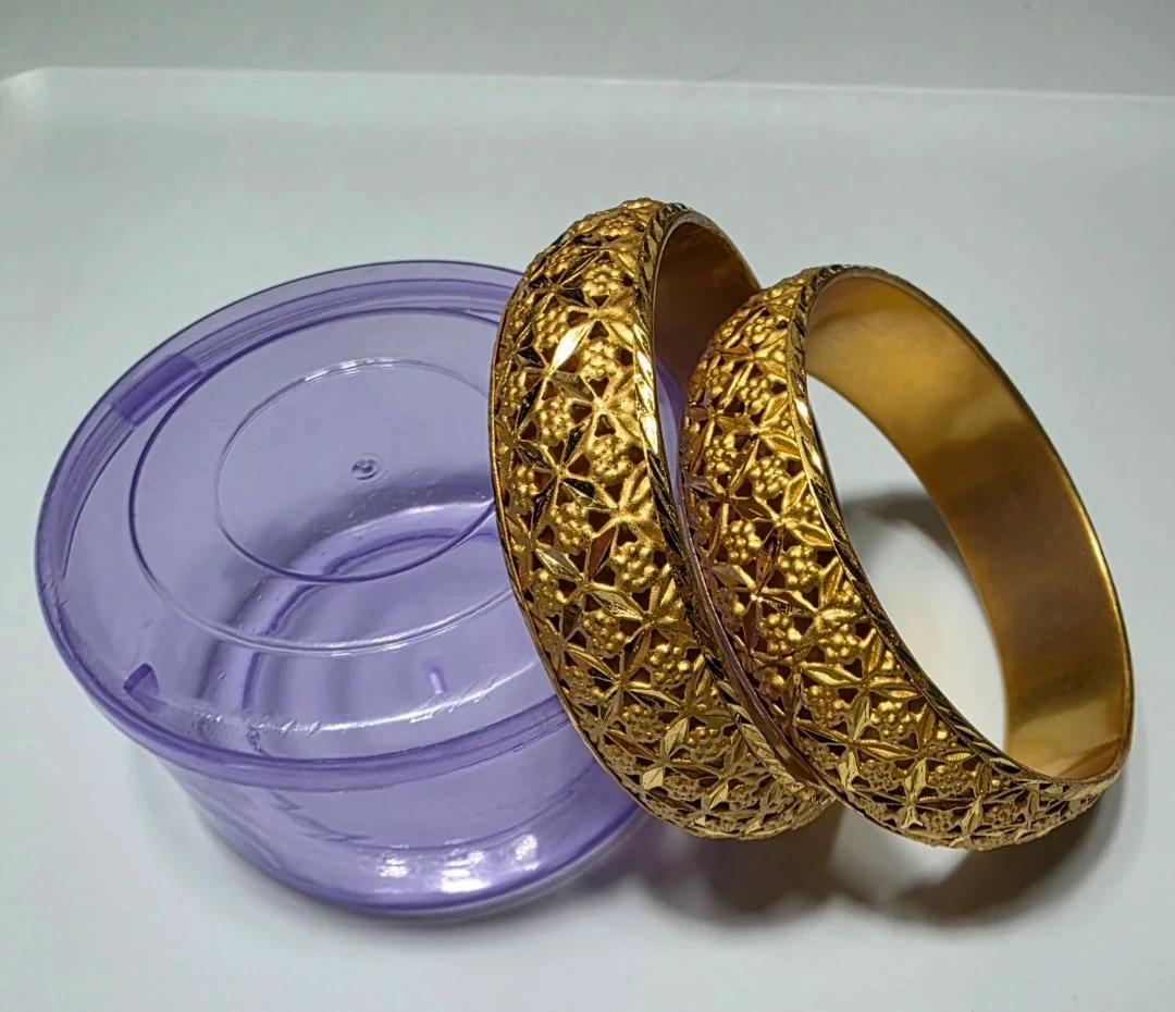 Selling a beautiful set of gold bangles. They have a lovely intricate design and come with a purple container for storage. Great for adding a touch of elegance to any outfit!