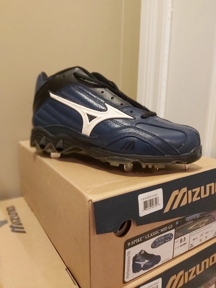NEW Blue and white Mizuno 9-Spike Classic Mid G3 baseball cleats. Lace-up closure and ankle protection. Size 8.5.