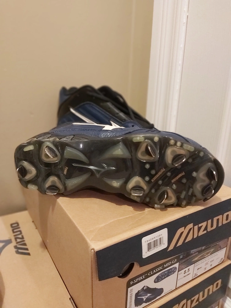 NEW Blue and white Mizuno 9-Spike Classic Mid G3 baseball cleats. Lace-up closure and ankle protection. Size 8.5.