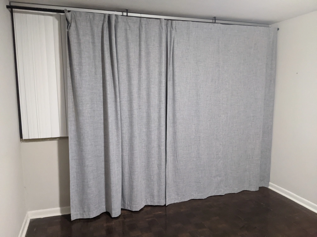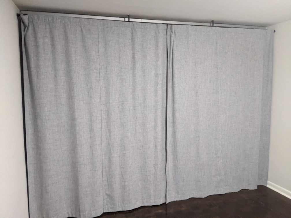 Curtains have been sewn together and are damaged in places (see photo) but functional. Curtain rod was used in a room 9 feet wide.
