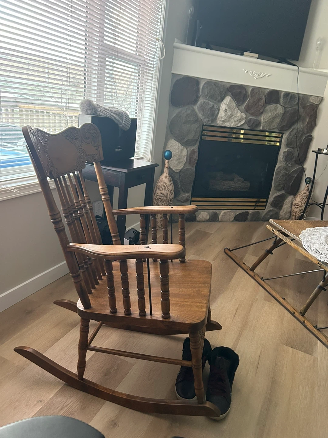 This is a classic wooden rocking chair with an ornate carved back. It's made of solid wood with a warm, natural finish. The rocking mechanism works smoothly. Adds a cozy touch to any room!