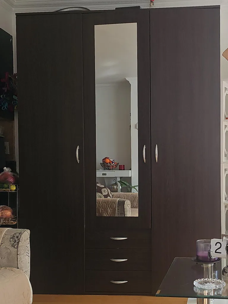 This wardrobe features three doors and a full-length mirror on the center door. It also has three built-in drawers at the bottom for extra storage. Dark wood finish.