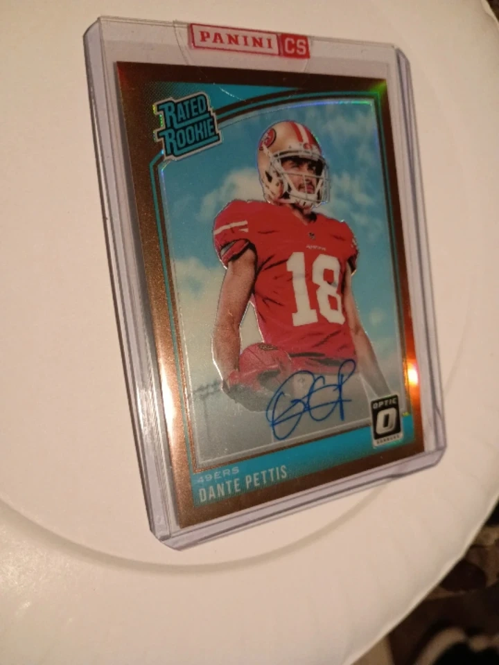This is a Panini Rated Rookie football card featuring Dante Pettis. It's autographed and comes in a protective sleeve. This card is from the Optic line.