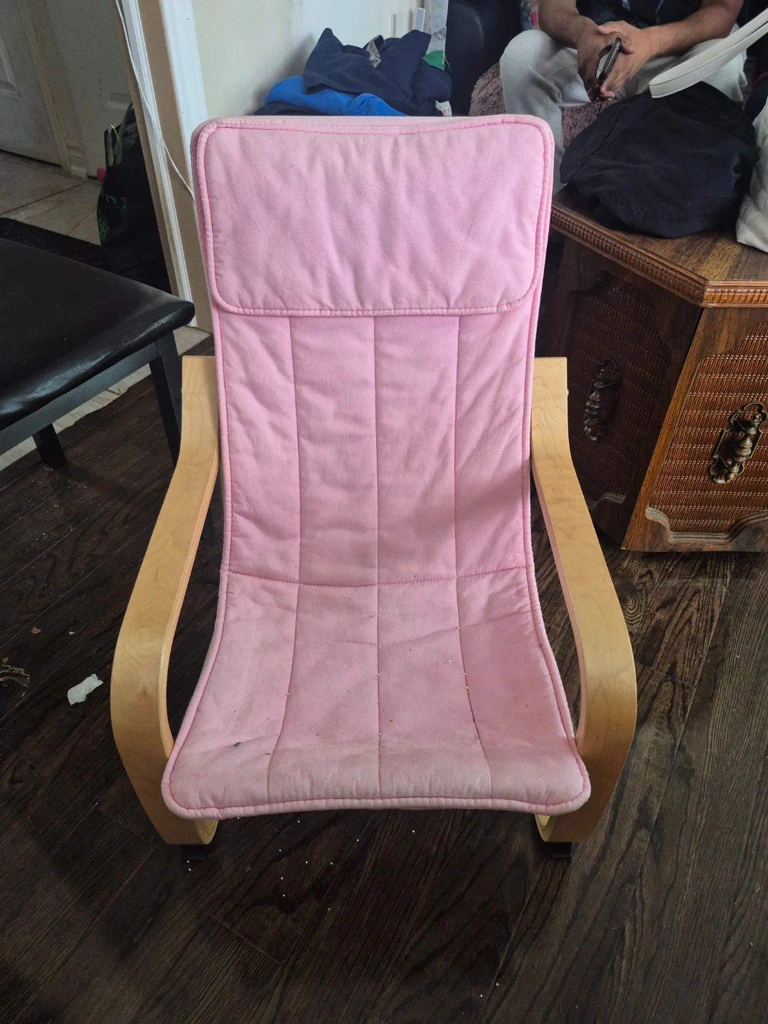 This is a pink IKEA POÄNG chair with a wooden frame. It's a comfy addition to any room. Perfect for reading or relaxing!