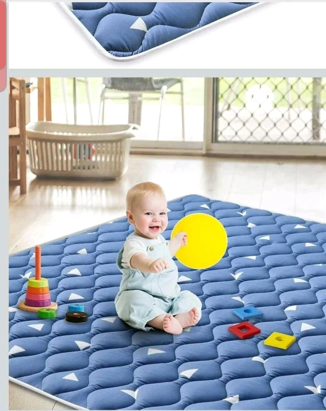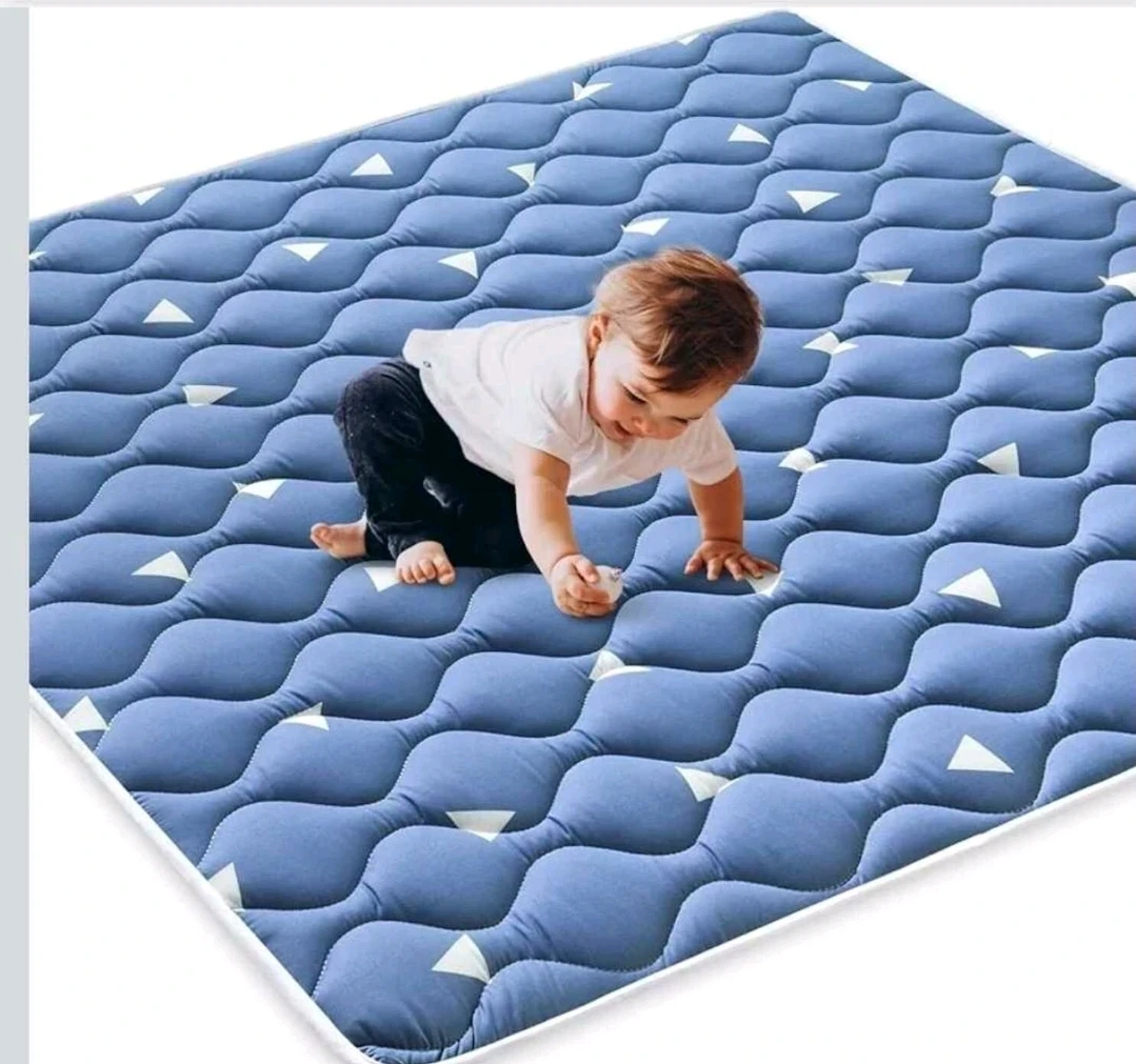 This padded play mat is perfect for tummy time and early explorations! It features a soft, quilted texture with a fun blue and white pattern. Provides a safe and comfortable space for baby's adventures