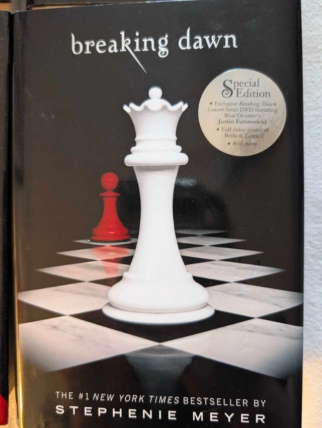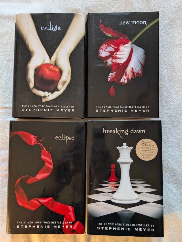 Selling a complete 4-book hardcover set of the Twilight Saga by Stephenie Meyer. Condition: Mint / Like New. These books are pristine. The bindings are tight, pages are crisp, and the dust jackets have no tears, folds, or fading. Perfect for a display shelf. Includes: Twilight (Hardcover), New Moon (Hardcover), Eclipse (Hardcover), Breaking Dawn (Hardcover) - Special Edition: This rare version includes the exclusive Breaking Dawn Concert Series DVD and a Full-Colour Poster of Bella and Edward (both included and intact inside the book). This is a beautiful, gift-quality set for a fan who wants a perfect copy without the wear and tear usually found on used books. Available for pickup in Downtown Toronto at Homewood Avenue and Wellesley Street.
