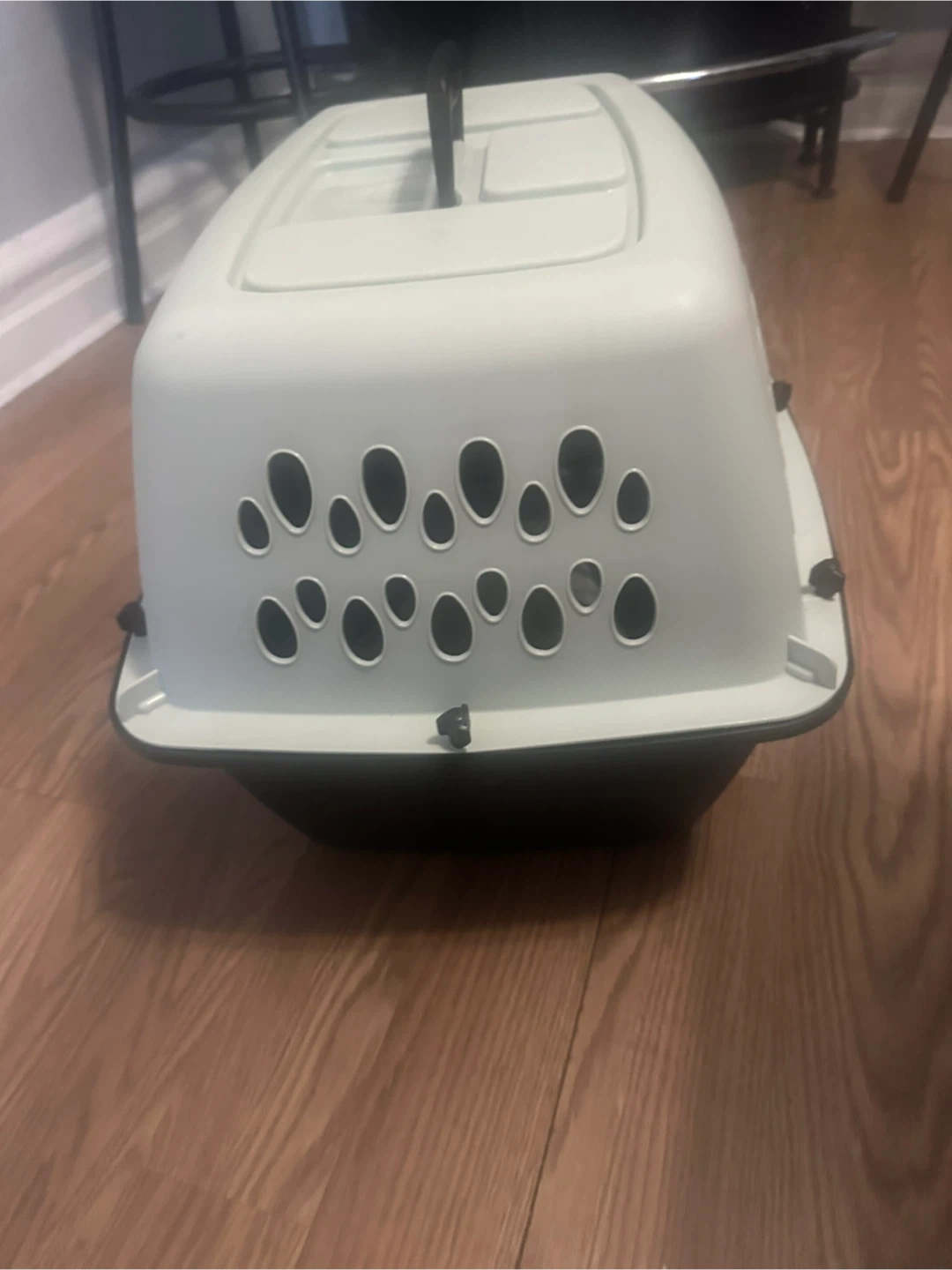 This is a sturdy pet carrier crate, perfect for transporting small to medium-sized pets. It's made of durable plastic with ventilation on all sides. The secure latch ensures your pet stays safe inside.