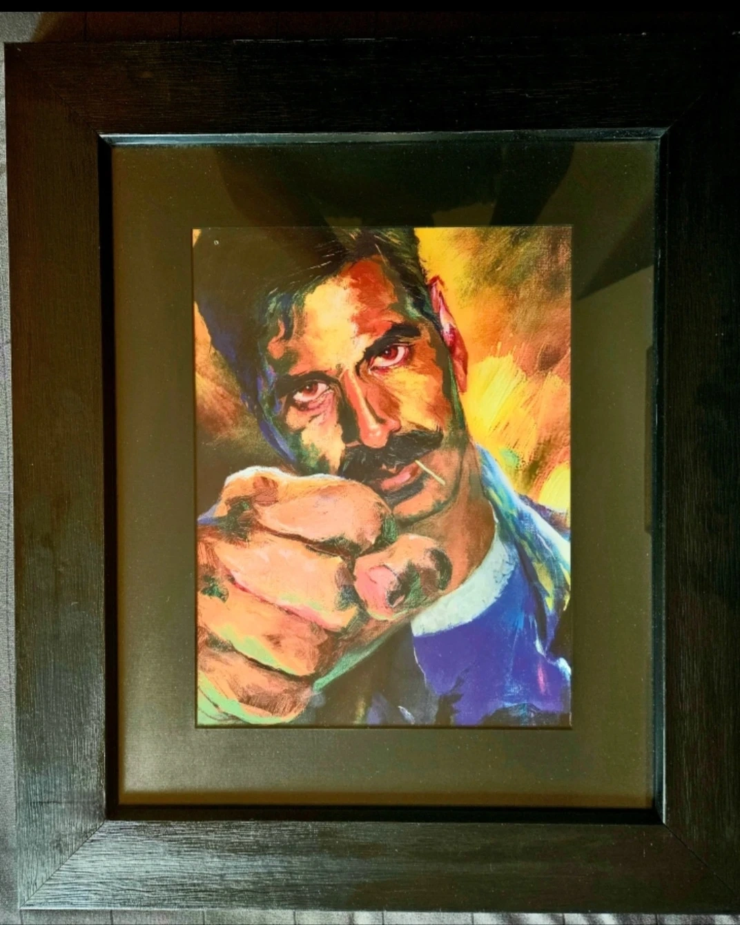 Contemporary framed artwork featuring a man with a moustache. It's a colourful and expressive portrait.