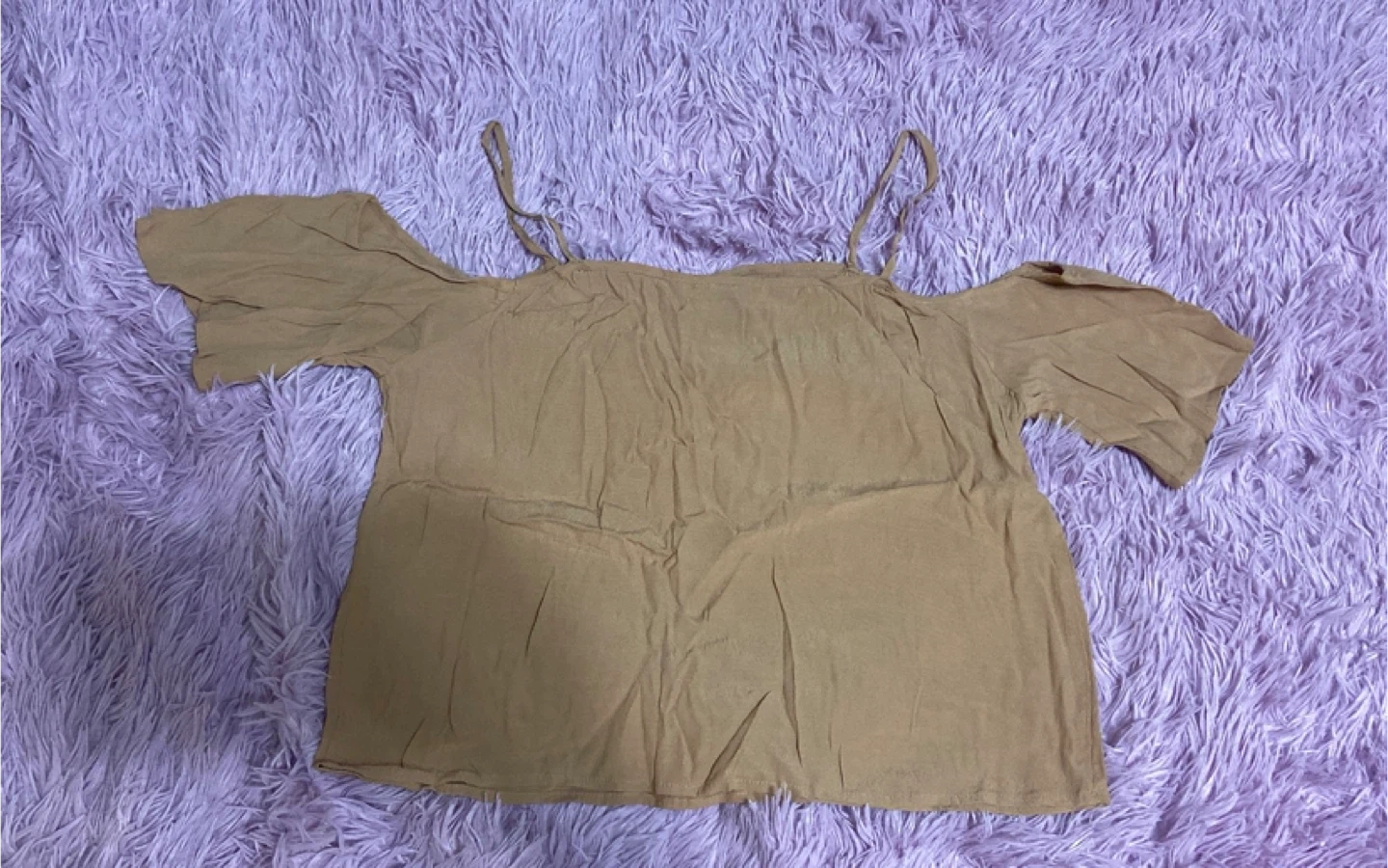 This is a women's off-the-shoulder tunic top. It has short, ruffled sleeves and adjustable spaghetti straps. The fabric appears to be a lightweight, soft material.