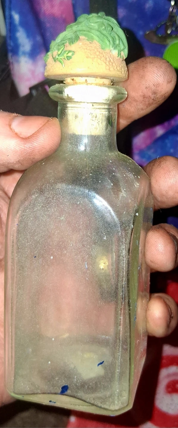 This is a small, clear glass bottle with a unique decorative stopper. The stopper has a textured yellow base and a green, sculpted top resembling foliage. It's designed to hold small amounts of liquid or decorative items. Pick up only unless near intersection of Oxford and Gammage Street.
