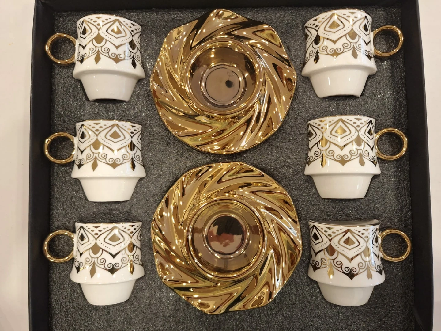 NEW! Beautiful white and gold plated Turkish coffee/tea set for 6 in original box. Selling for less than half-price!