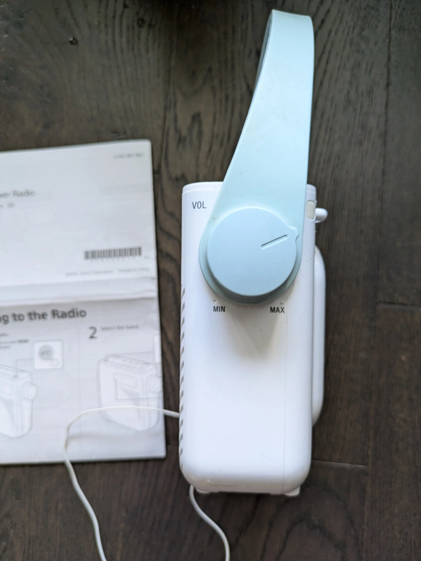 Great little shower clock radio, I'm just moving so looking for a new home. it let's you set 5 presets for stations, has a timer, and keeps time. Includes instruction manual, but you need 3 C batteries. It always lasted me many months, uses low power.