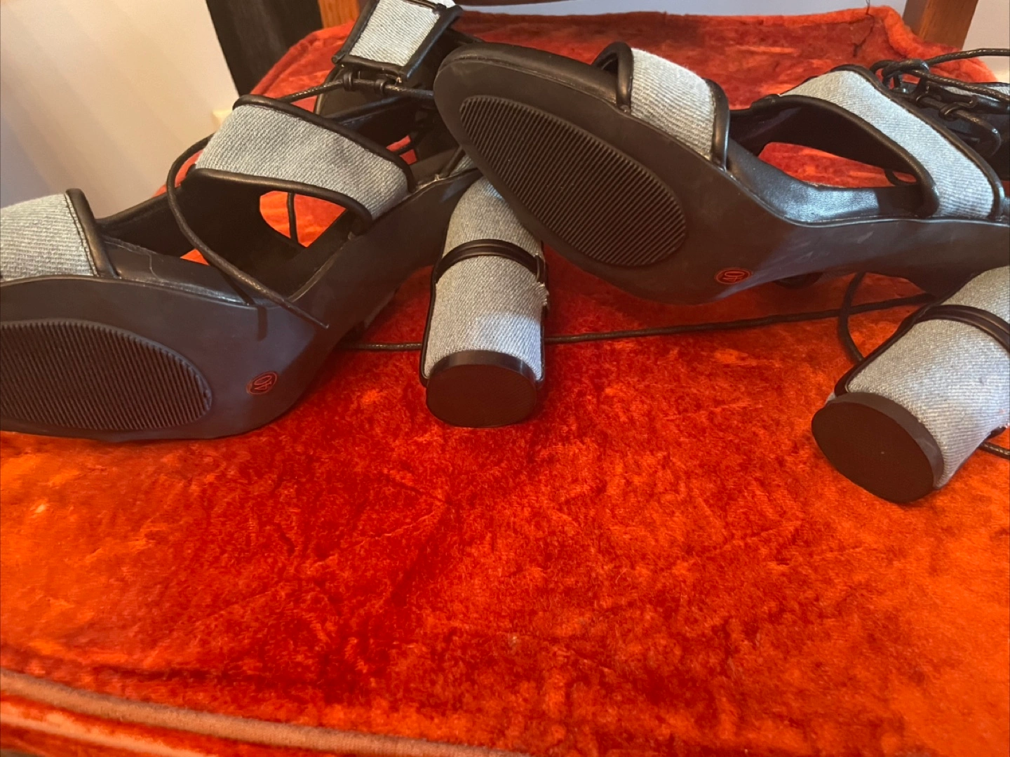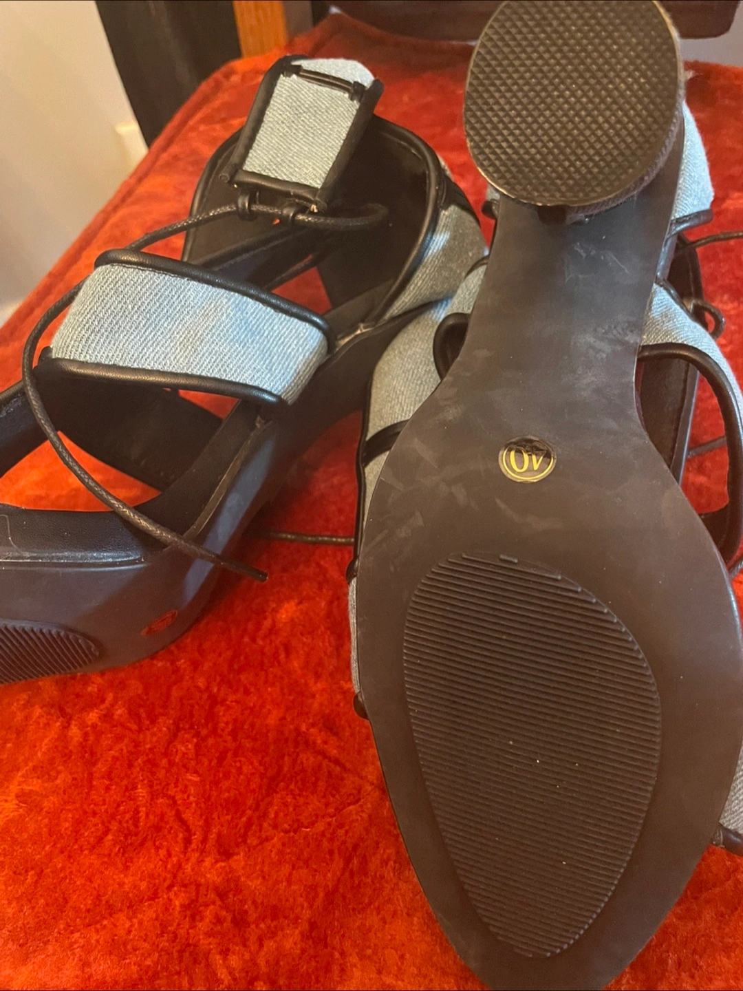 These heels feature a unique denim patchwork cage design and black leather design with lace-up detailing.