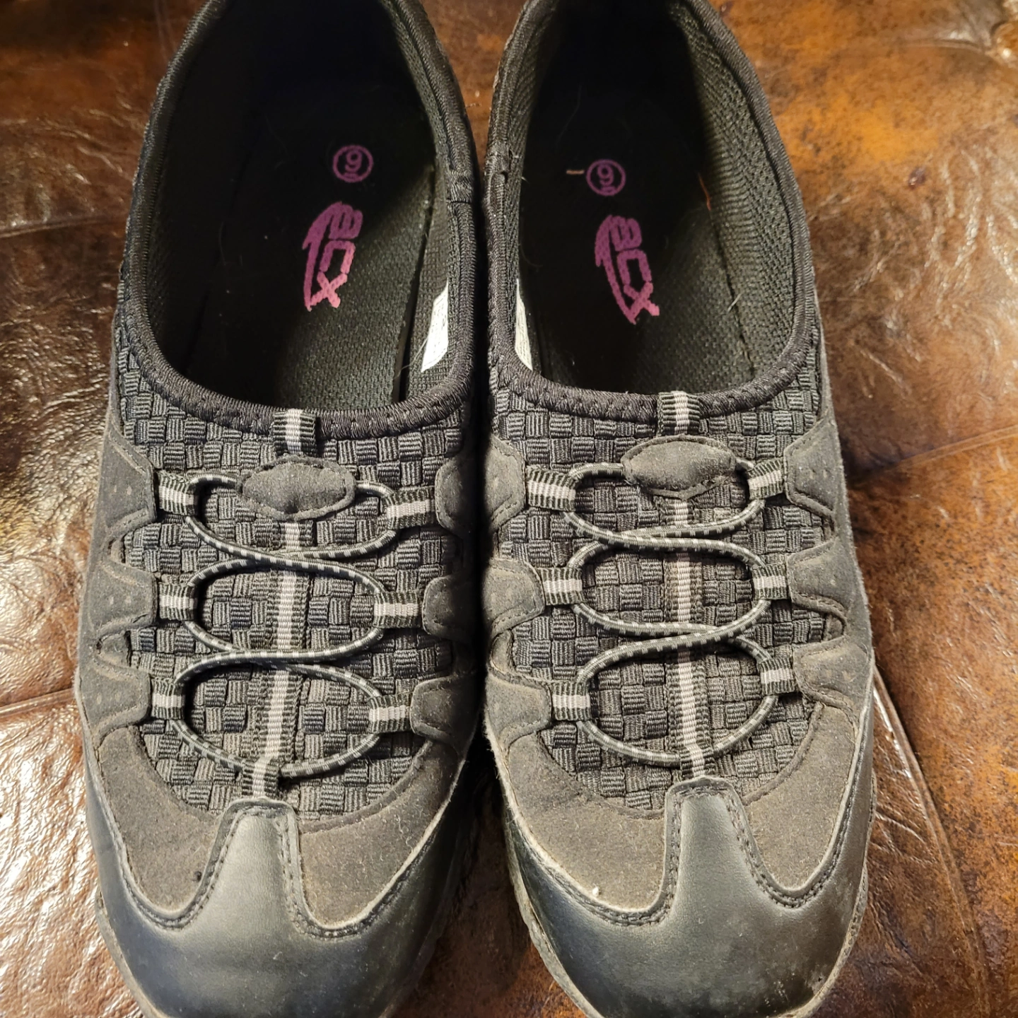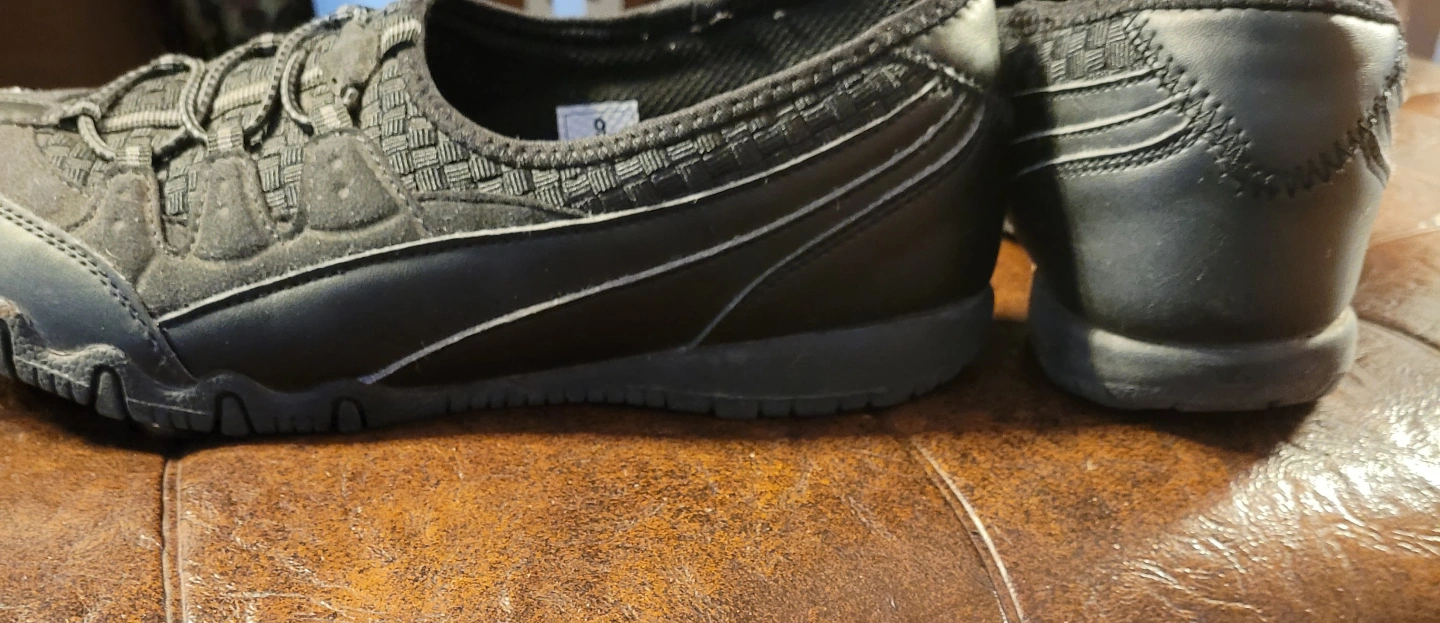 Black slip-on shoes. Features a woven and leather-like design.They would be great for a walk in the park or a relaxing stroll through the city.