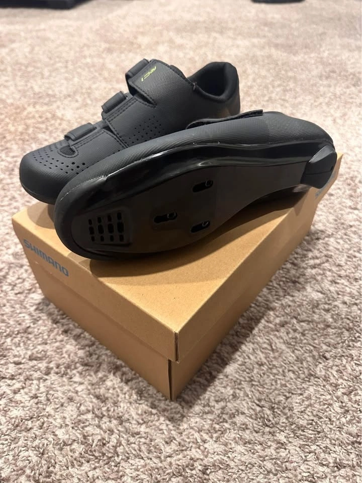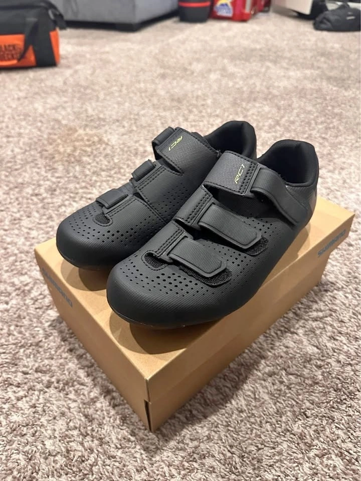 Brand new Shimano RC1 cycling shoes, size 40. Originally purchased for Peloton. These fit a US women's 8-8.5. Cleats are not included. They have a 3-bolt pattern. Pick up in Cochrane.