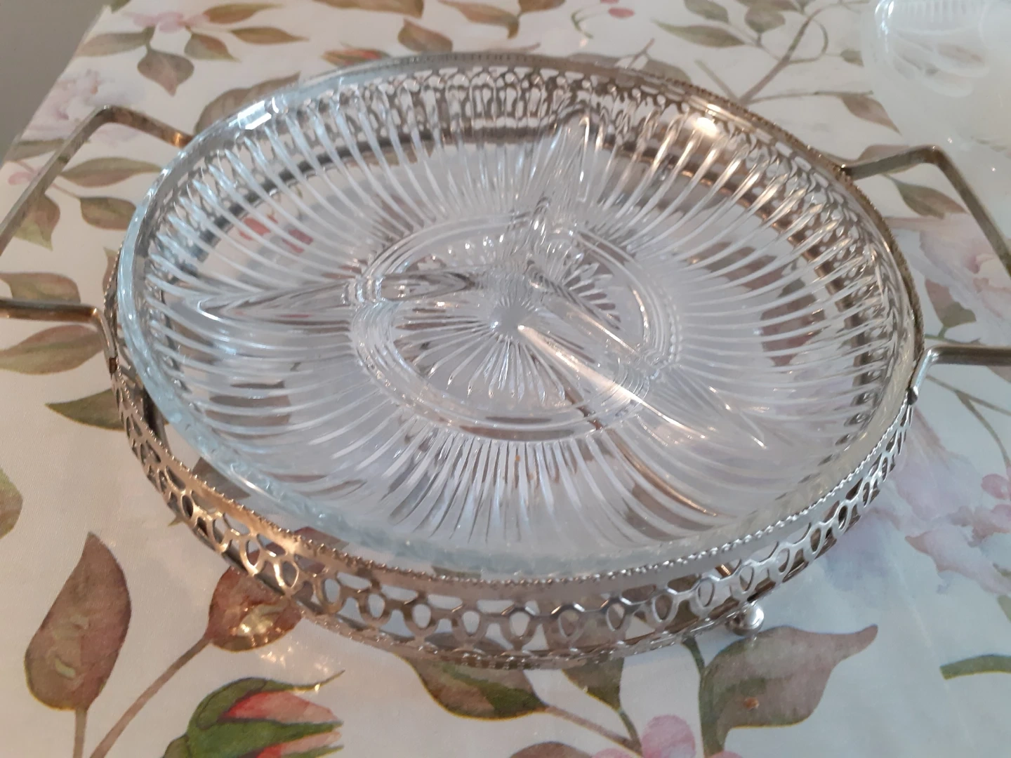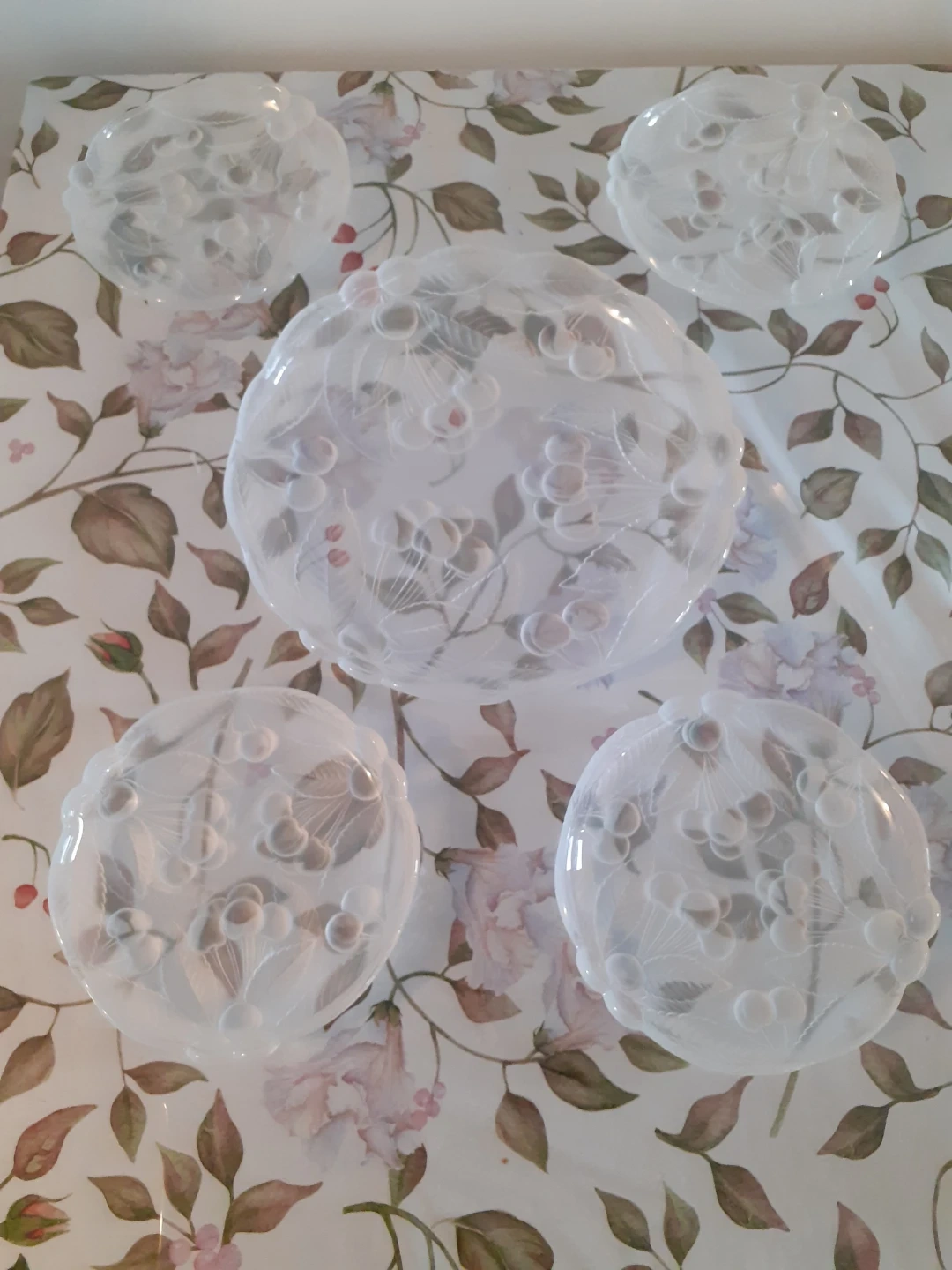 Set includes a glass divided serving platter with a silver-toned metal stand. Also features a frosted glass serving dish with lid and several matching frosted glass small plates, all embossed with a cherry blossom design. Perfect for serving appetizers or desserts at gatherings!