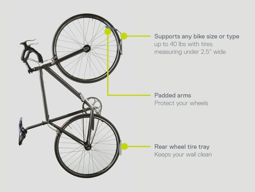 •Vertical Mount Holds Up to 40 lbs. with Tires measuring under 2.5" wide.