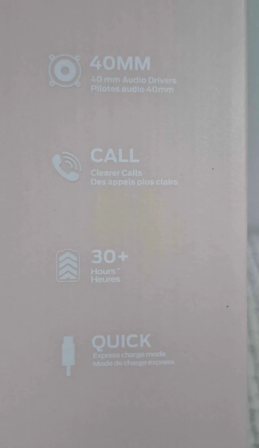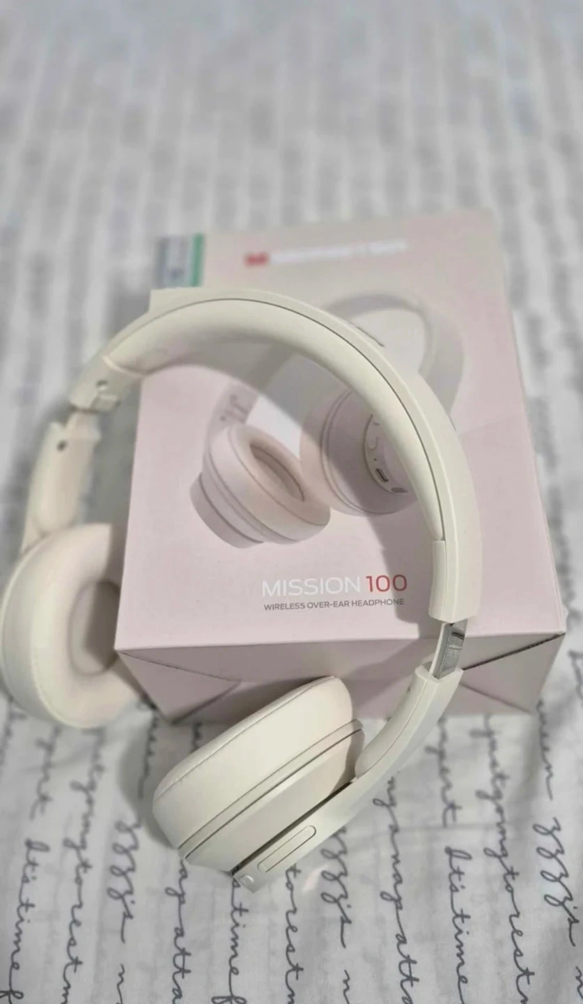 Mission 100 wireless over-ear headphones with 40mm audio drivers. Offers over 30 hours of playback and a quick charge mode. Includes charging cable and manual. Great for everyday listening!