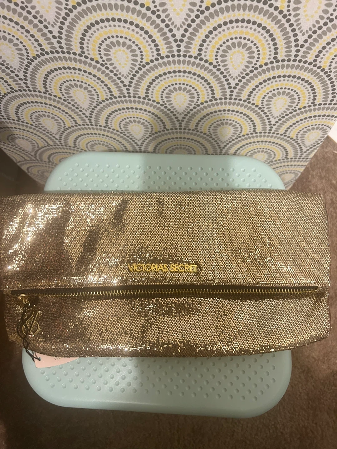 Sparkly gold sequin clutch bag from Victoria's Secret. It has a zip closure and a fold-over design. A stylish accessory for evenings out!