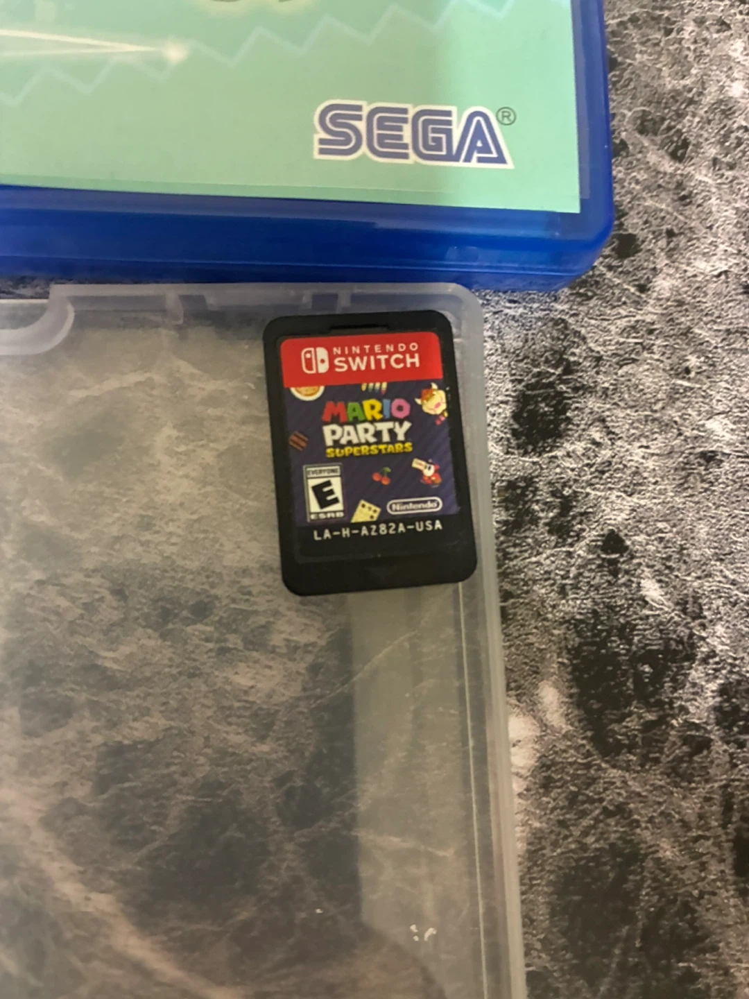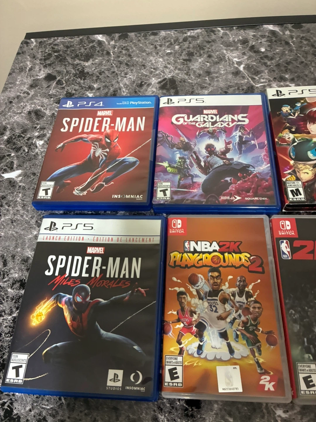 Bundle includes PS4 Spider-Man, PS5 Guardians of the Galaxy, PS5 Persona 5 Royal, PS4 Sonic Colors Ultimate, PS5 Spider-Man Miles Morales, NBA 2K23 for Switch, and NBA 2K25 for Switch. Also includes Mario Party Superstars for Switch. Cases are included for all games.