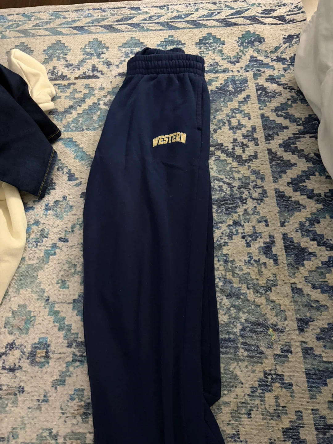 Comfy navy sweatpants with 'WESTERN' embroidered on the leg. Elastic waistband and cuffs for a good fit. These are great for lounging or casual wear.