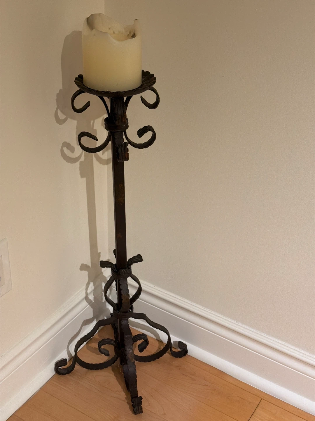 A 27 inch tall wrought iron candle holder. It holds one pillar candle and has a sturdy base.