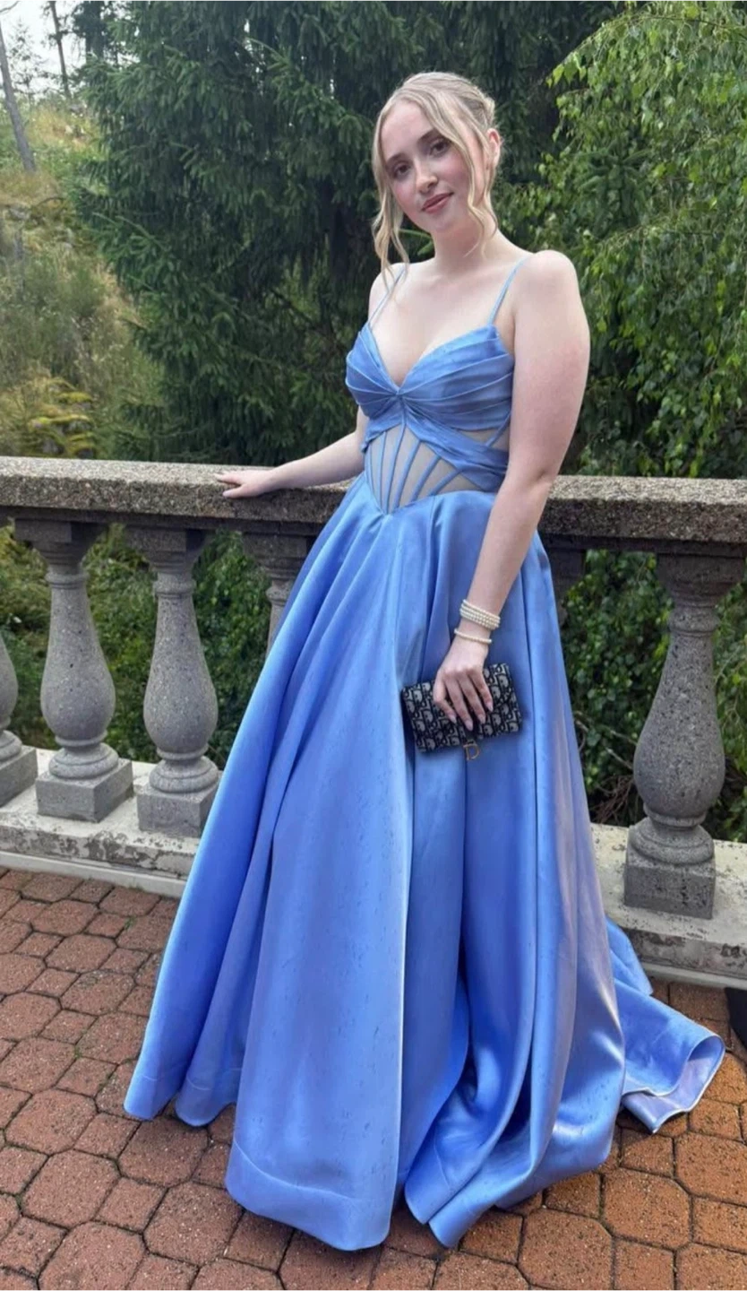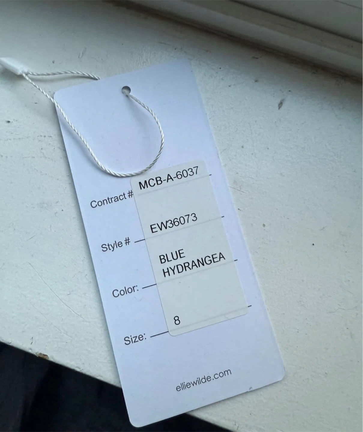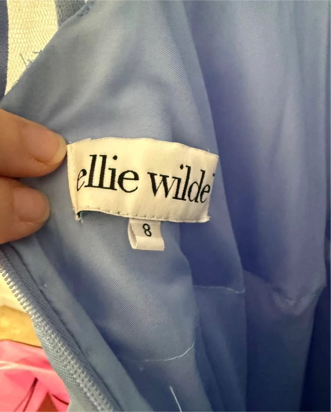This is a beautiful blue Ellie Wilde formal dress. It's a size 8 and features a flowing satin skirt with a fitted bodice. The dress is perfect for special occasions like proms or weddings!