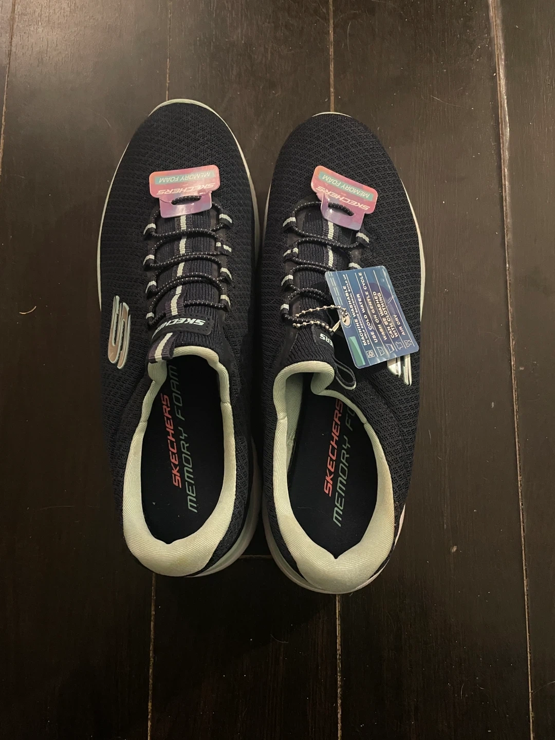 navy blue sneakers with memory foam insoles. Mesh upper with synthetic sole. Lace-up style with elastic laces.