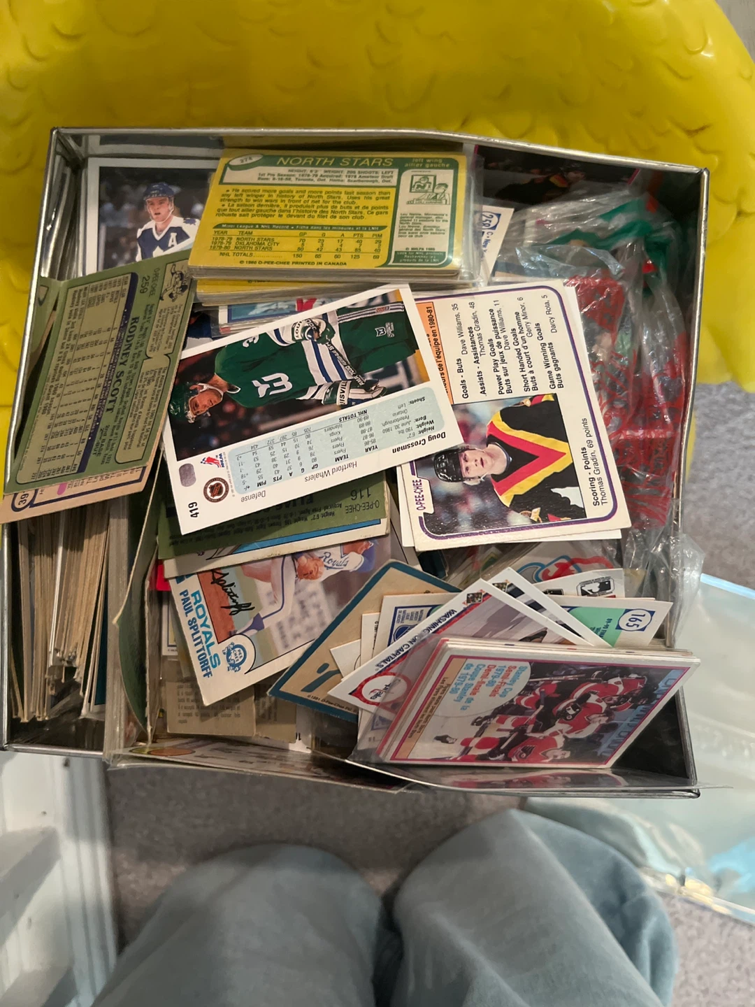 A collection of assorted hockey cards, including players like Doug Crossman and Thomas Gradin. Some cards are from the 1980s, with O-Pee-Chee branding visible. Contains cards from teams like the North Stars and Capitals.