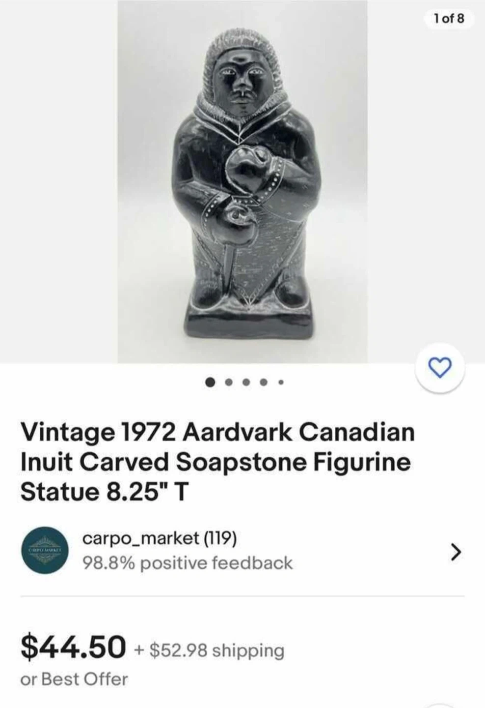 $40 Vintage (1972) AARDVARK Canadian Inuit carved soapstone heavy statue.