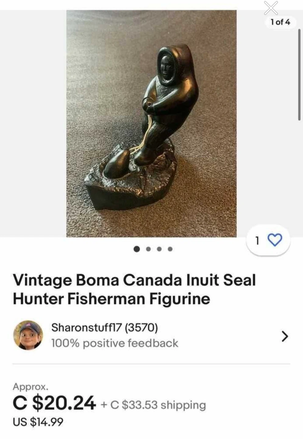 $10 Vintage Boma Canada Inuit Seal hunter figurine.