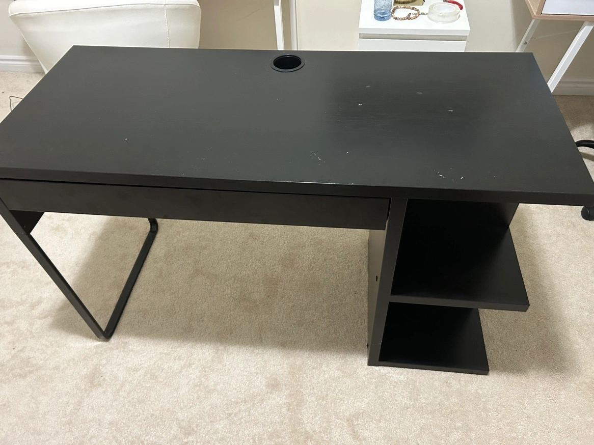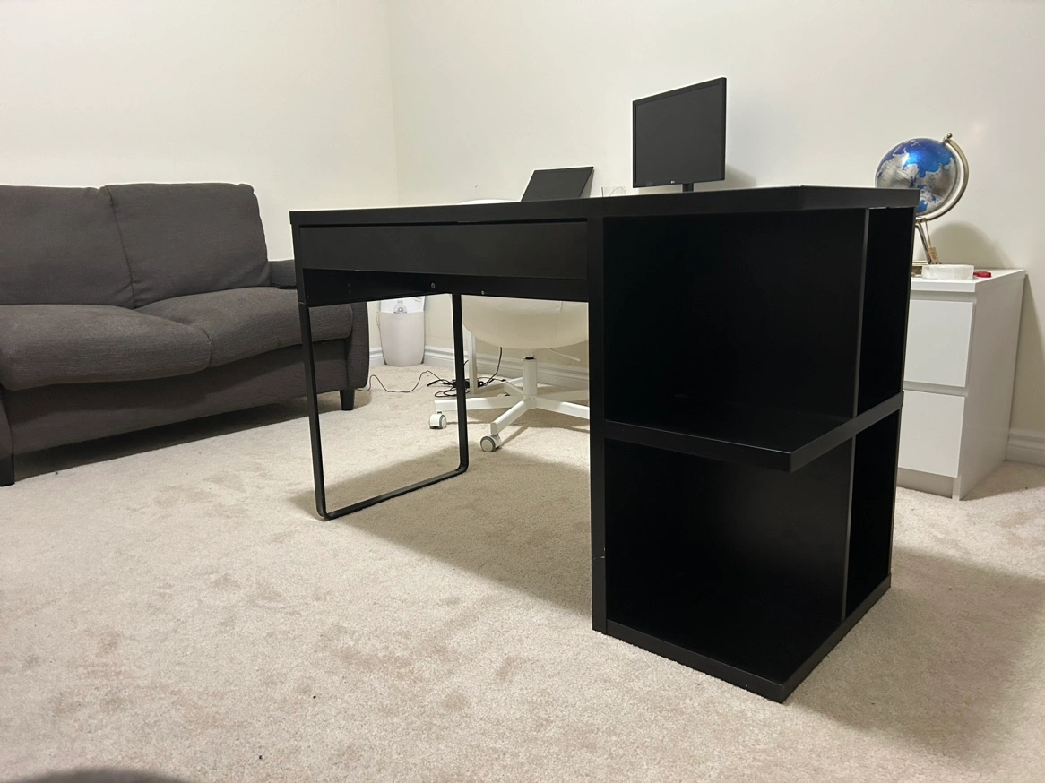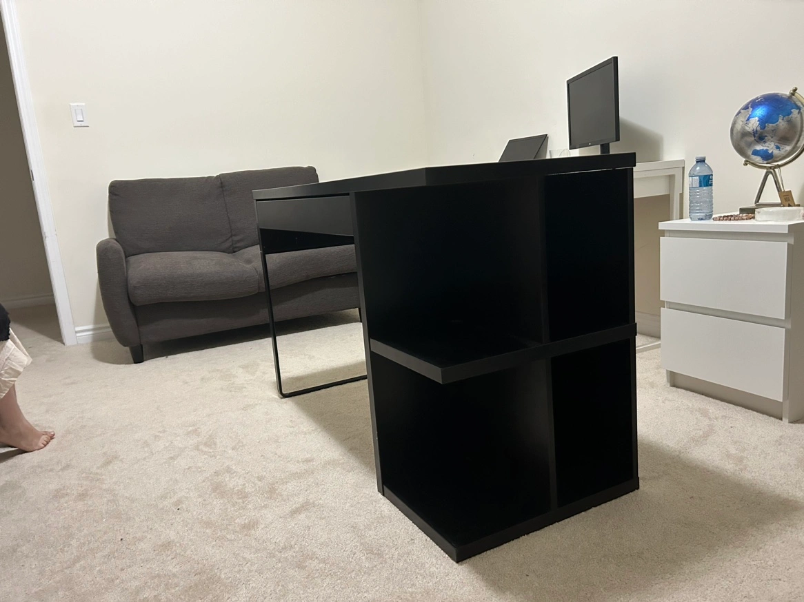 Office desk with four compartments on the side for storage along with a drawer and a compartment underneath to hold/hide the cables neatly. It also has a cable grommet for cleaner cable management.