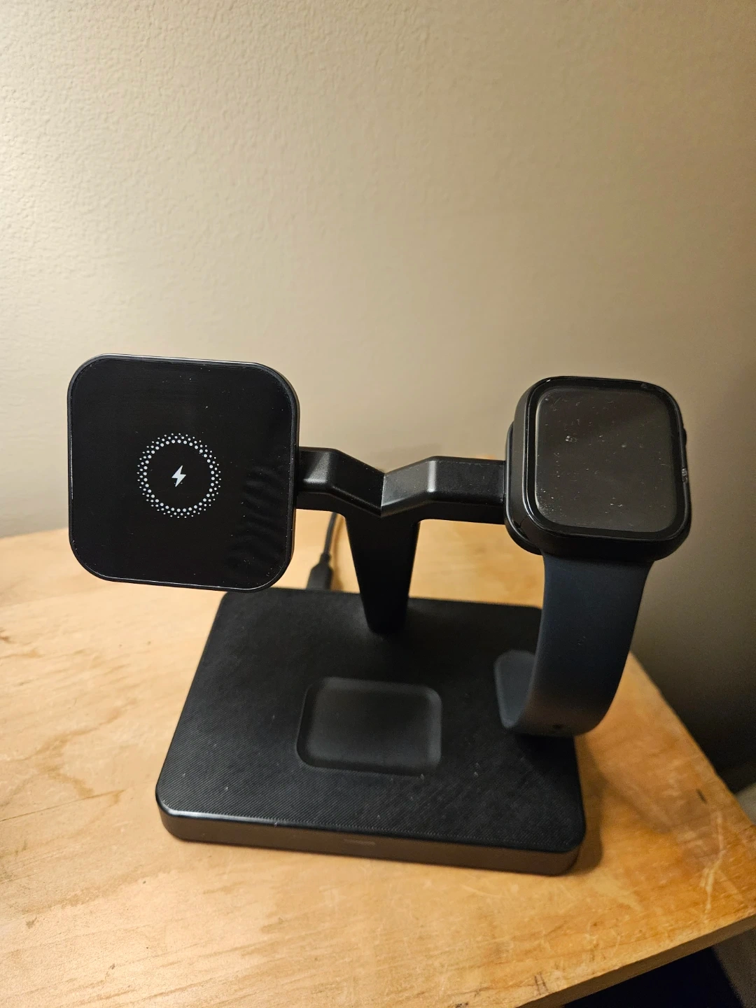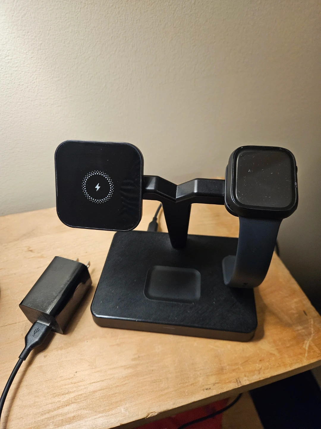 Black wireless charging stand. Charges phone, watch, and earbuds. Includes charging a charger cable. Keep your devices powered up and organized!